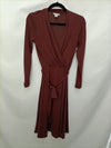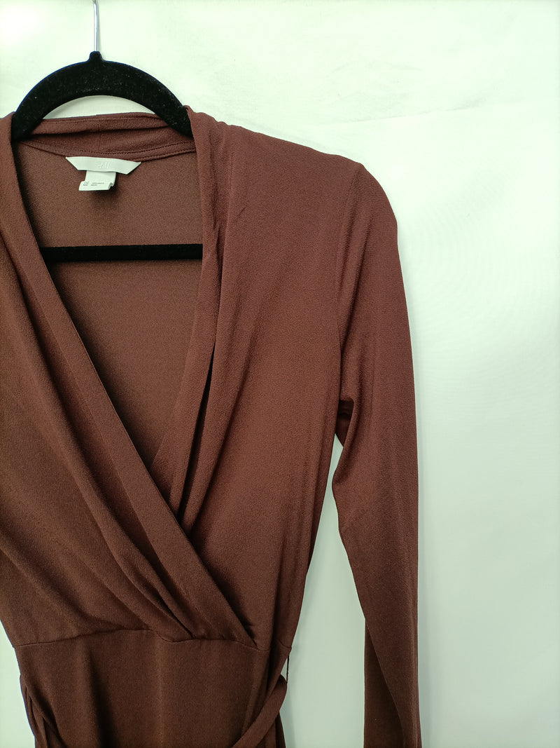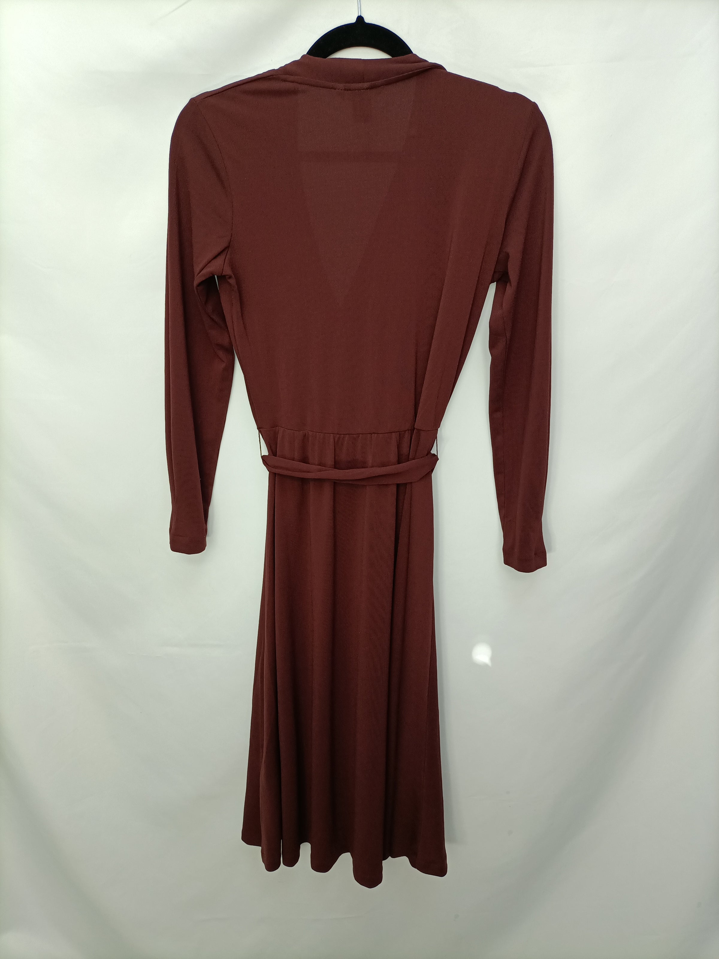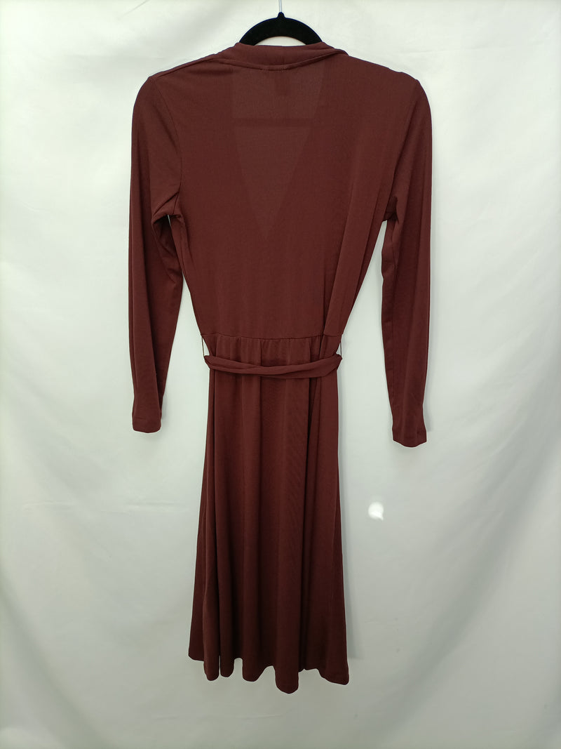 Vestido midi escote amplio en pico. Manga larga. Corte en la cintura con cinturón incorporado. Muy elástico