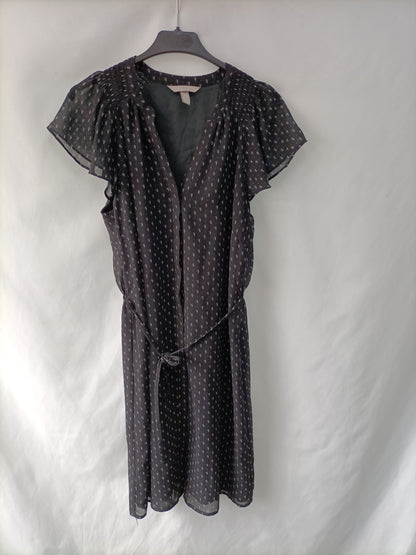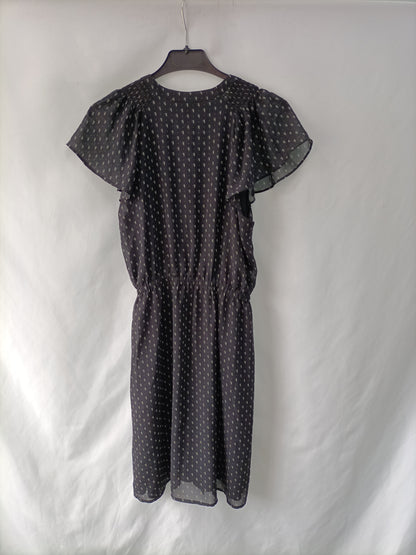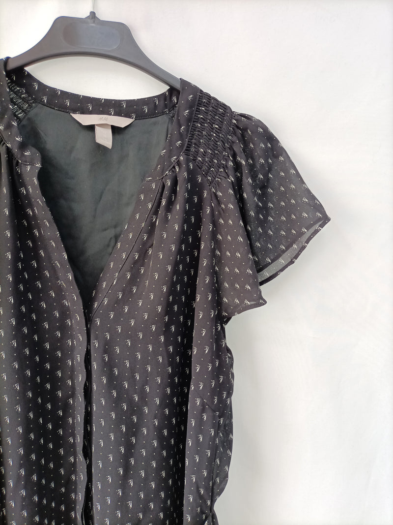 Vestido fluido negro con estampado en blanco. Cintura elástica ajustable con cuerda. De sisa a sisa 51 cm largo 92 cm