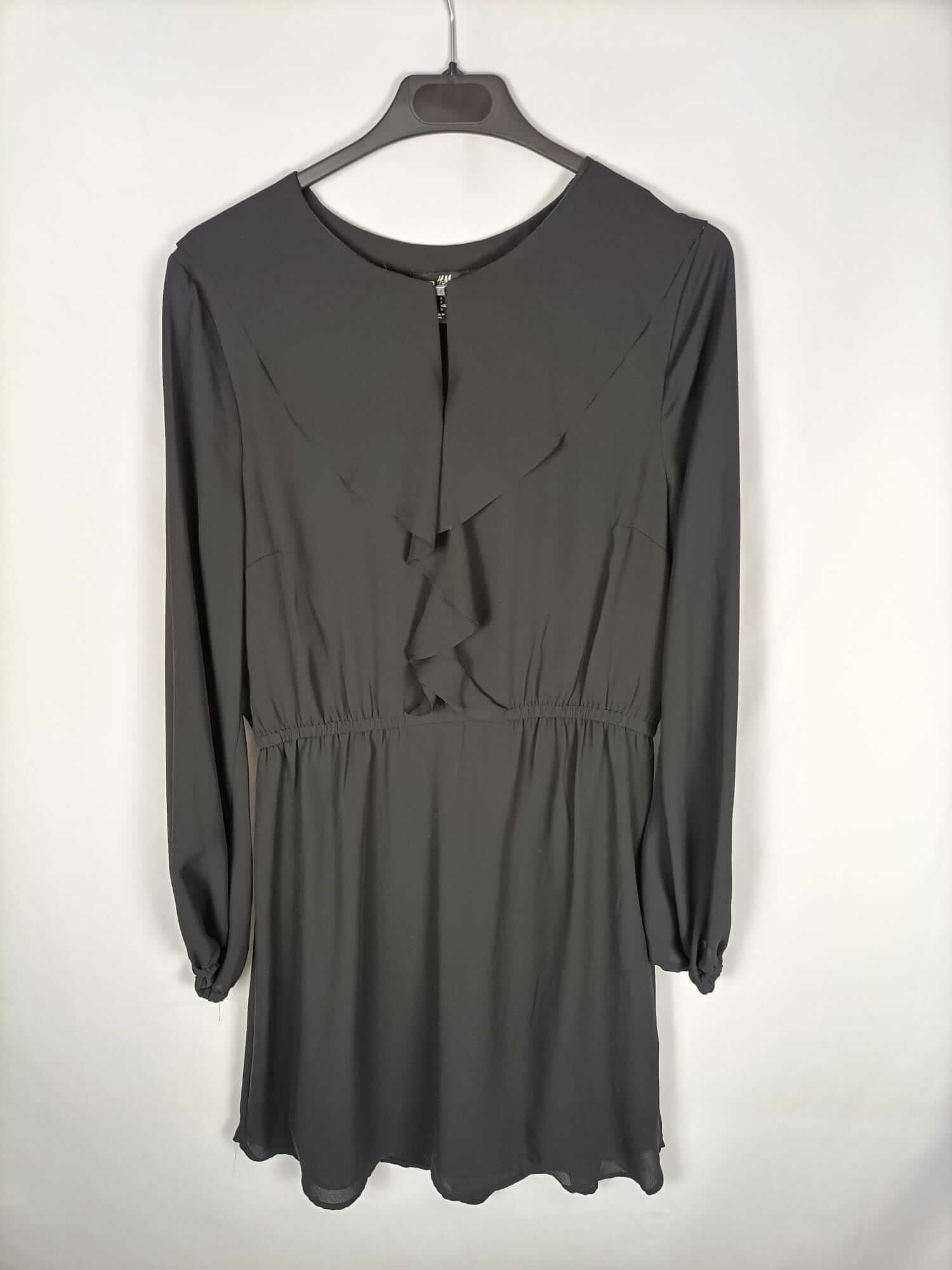 Hym. 38. Vestido negro corto y fluido con detalle de volante en el escote. Cintura elástica. De sisa a sisa 50 cm largo 90 cm