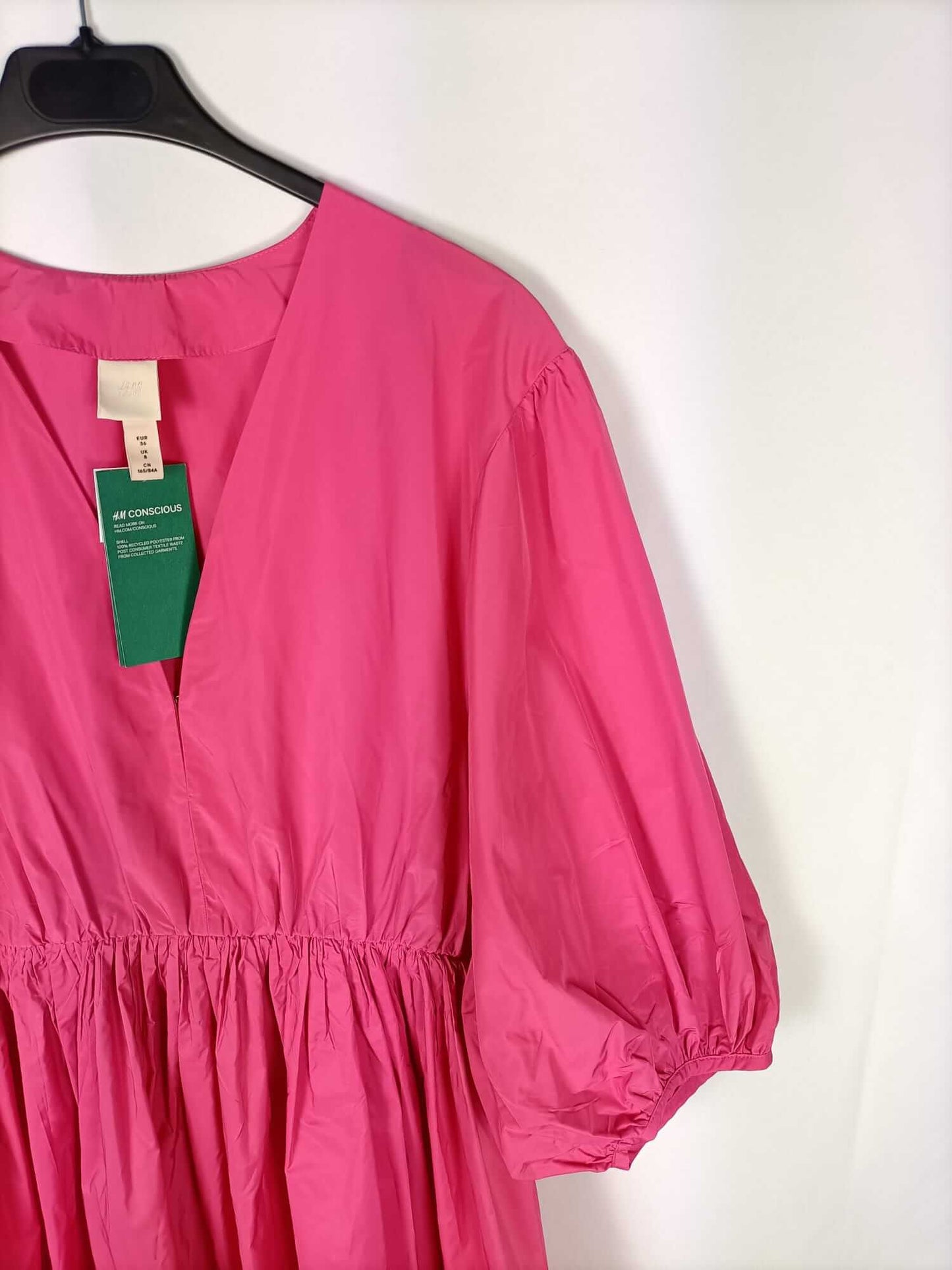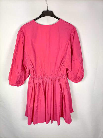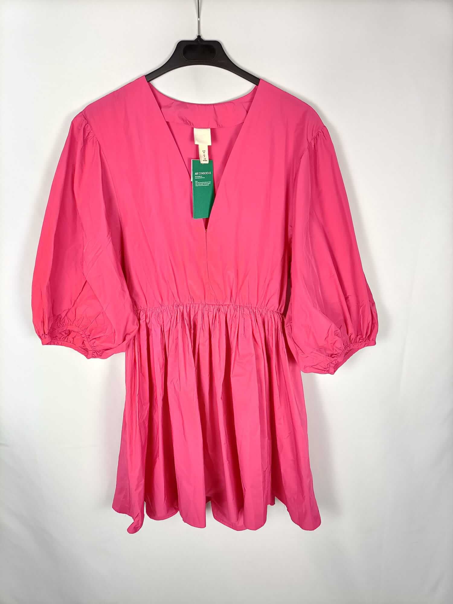 Hym. Vestido corto rosa con las mangas abullonadas 3/4 y cintura elástica. Tiene un poco de vuelo. De sisa a sisa 46 cm largo 88 cm