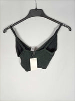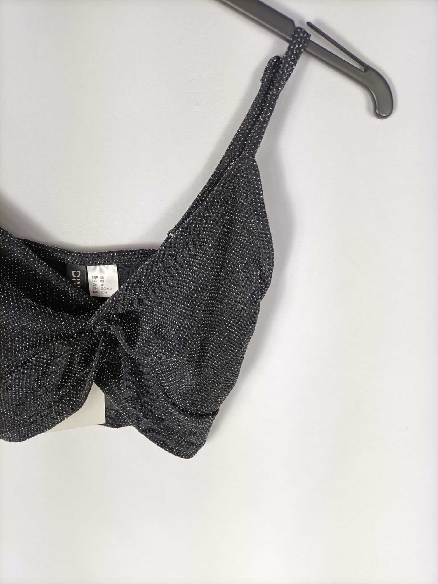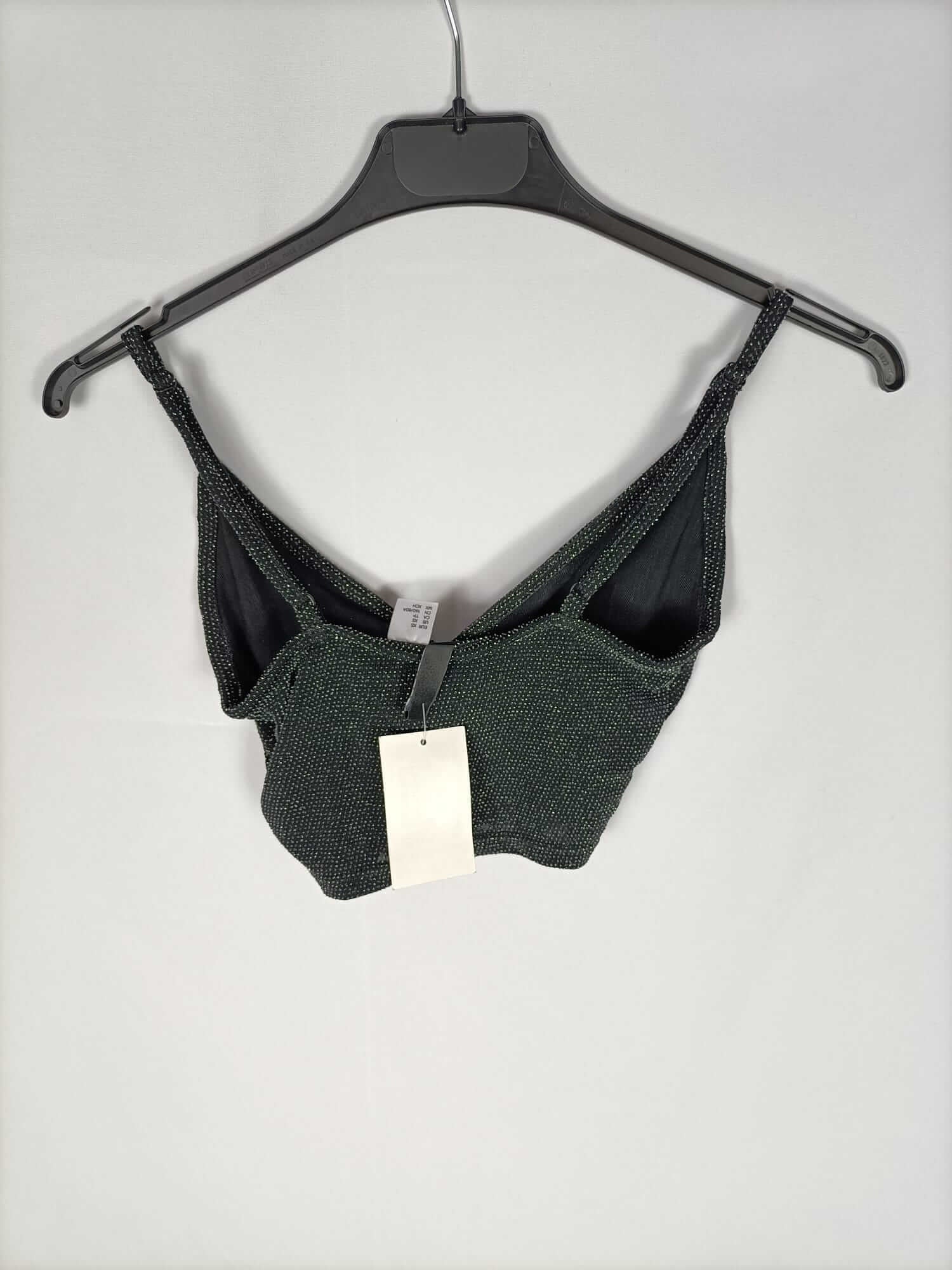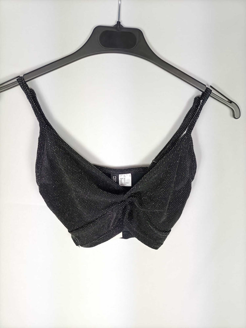 Hym. NUEVO CON ETIQUETA. Croptop negro elástico con purpurina. Tirantes ajustables. Largo 33 cm