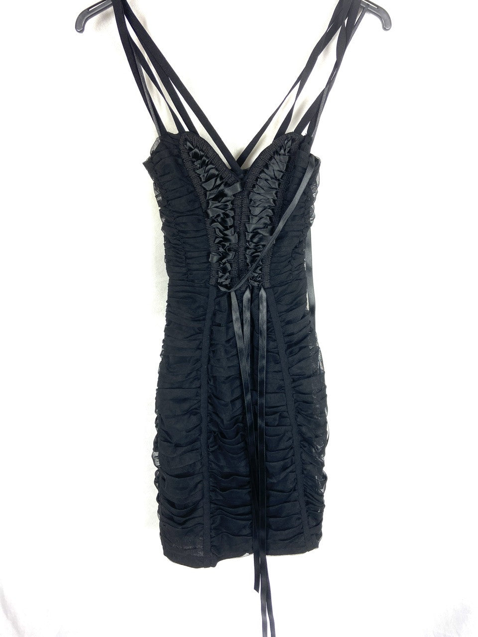 vestido fruncido tipo corsé negro con cuerdas y tirantes dobles cruzado. Cremallera trasera. Largo 82 cm