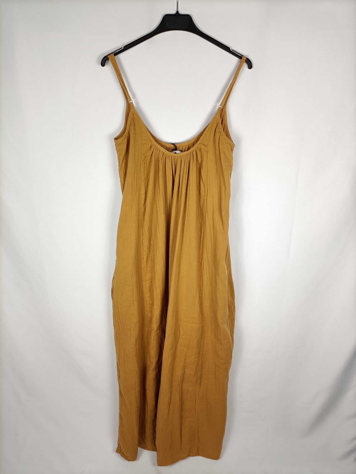 Hod. NUEVO CON ETIQUETA. Vestido largo mostaza de algodón fluido y con los tirantes ajustables. No elástico. Tiene bolsillo. De sisa a sisa 48 cm largo 140 cm