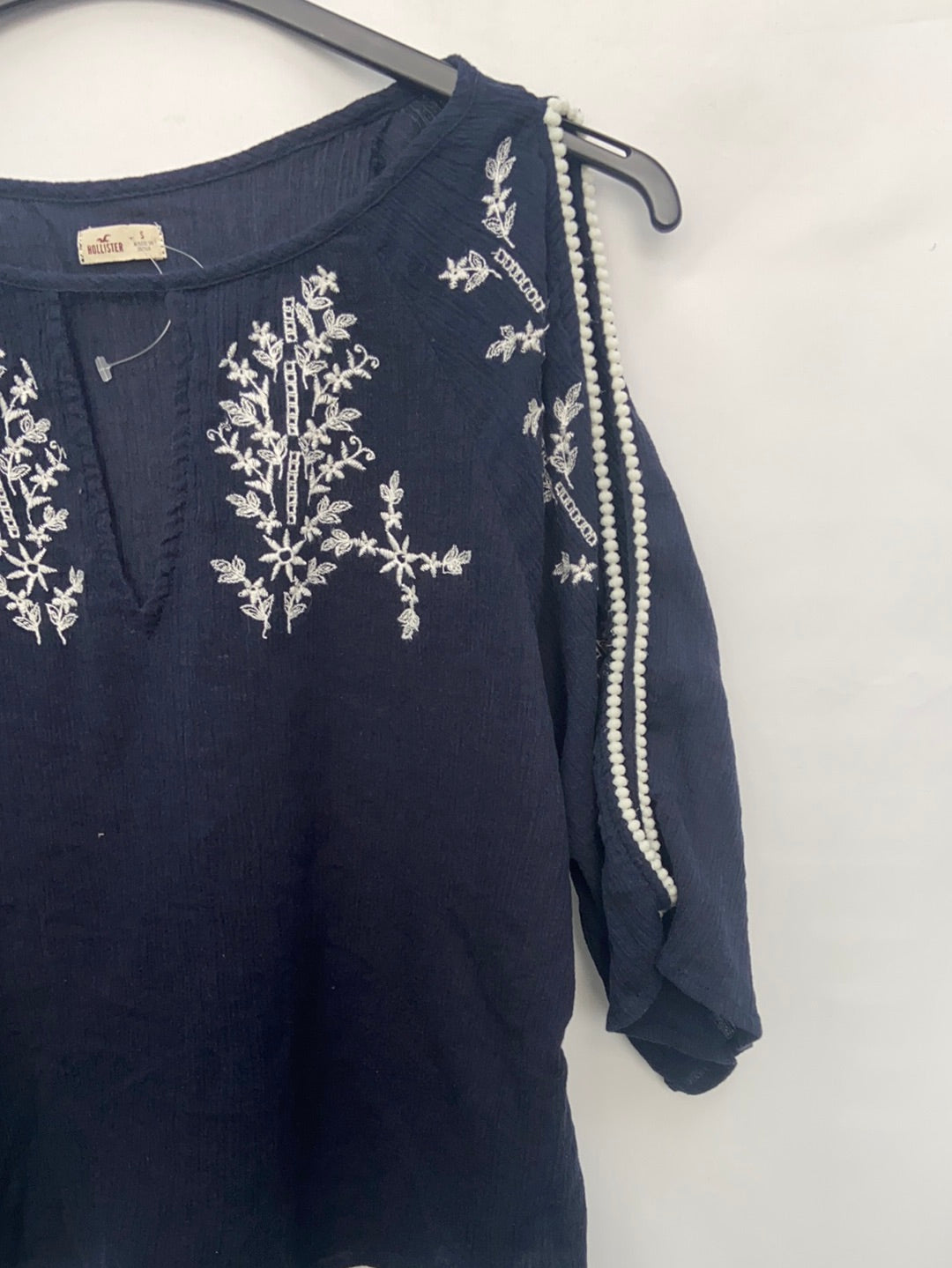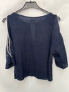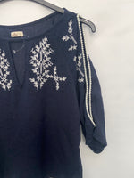 Camiseta con aperturas en hombros y escote. Color azul marino con bordados en blancos. Sin estrenar.