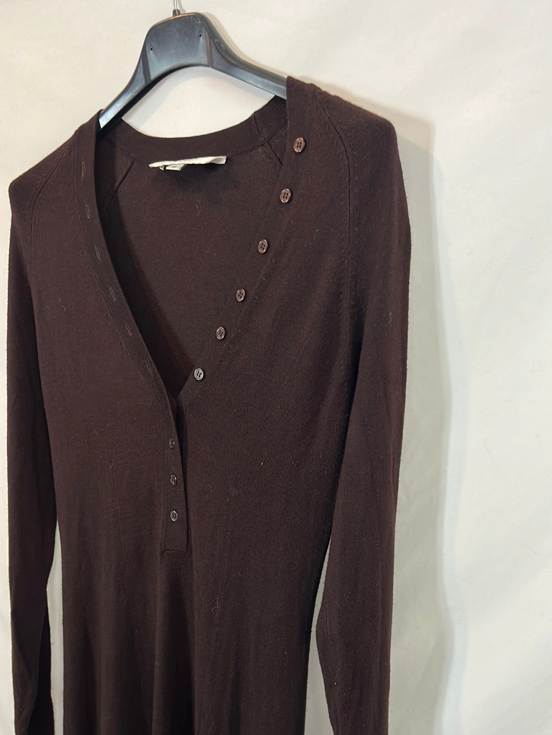 Vestido largo de punto marrón abotonado. Elástico. Hombros 39cm, largo 111cm