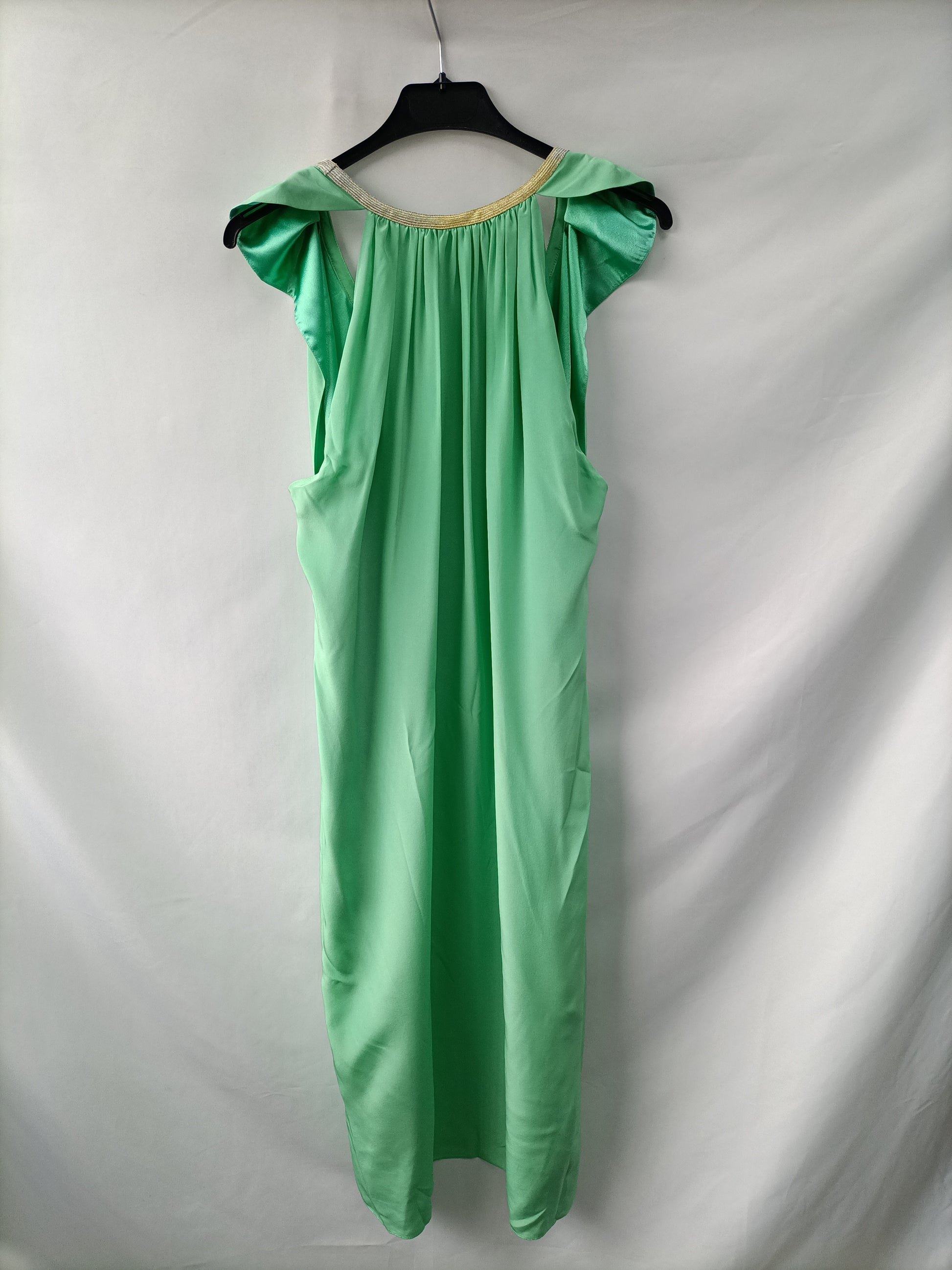 NUEVO CON ETIQUETA. Vestido verde largo, no elástico con cremallera lateral. Volantes mangas y detalle dorado. Largo 116 cm. Fuera para foto