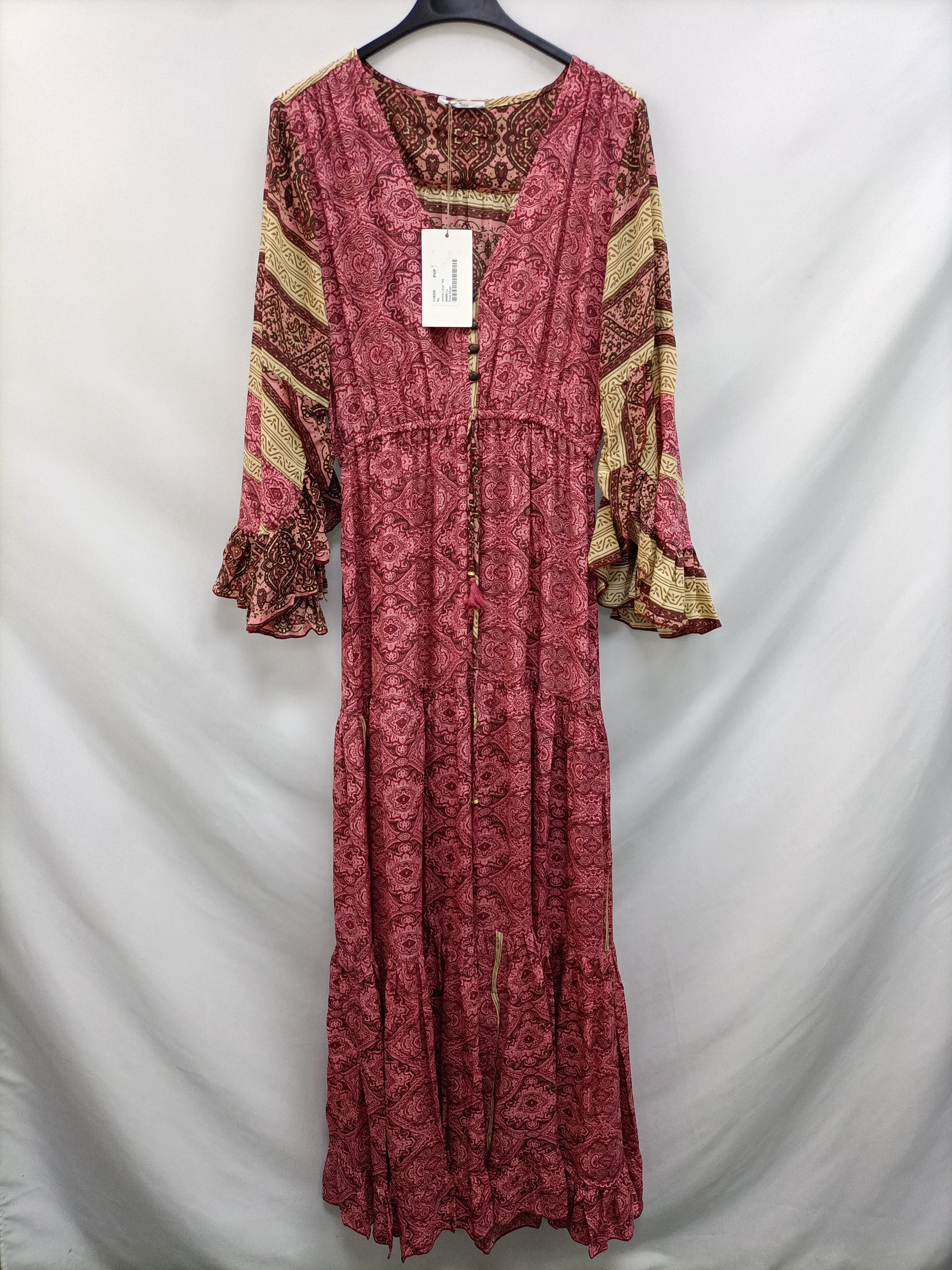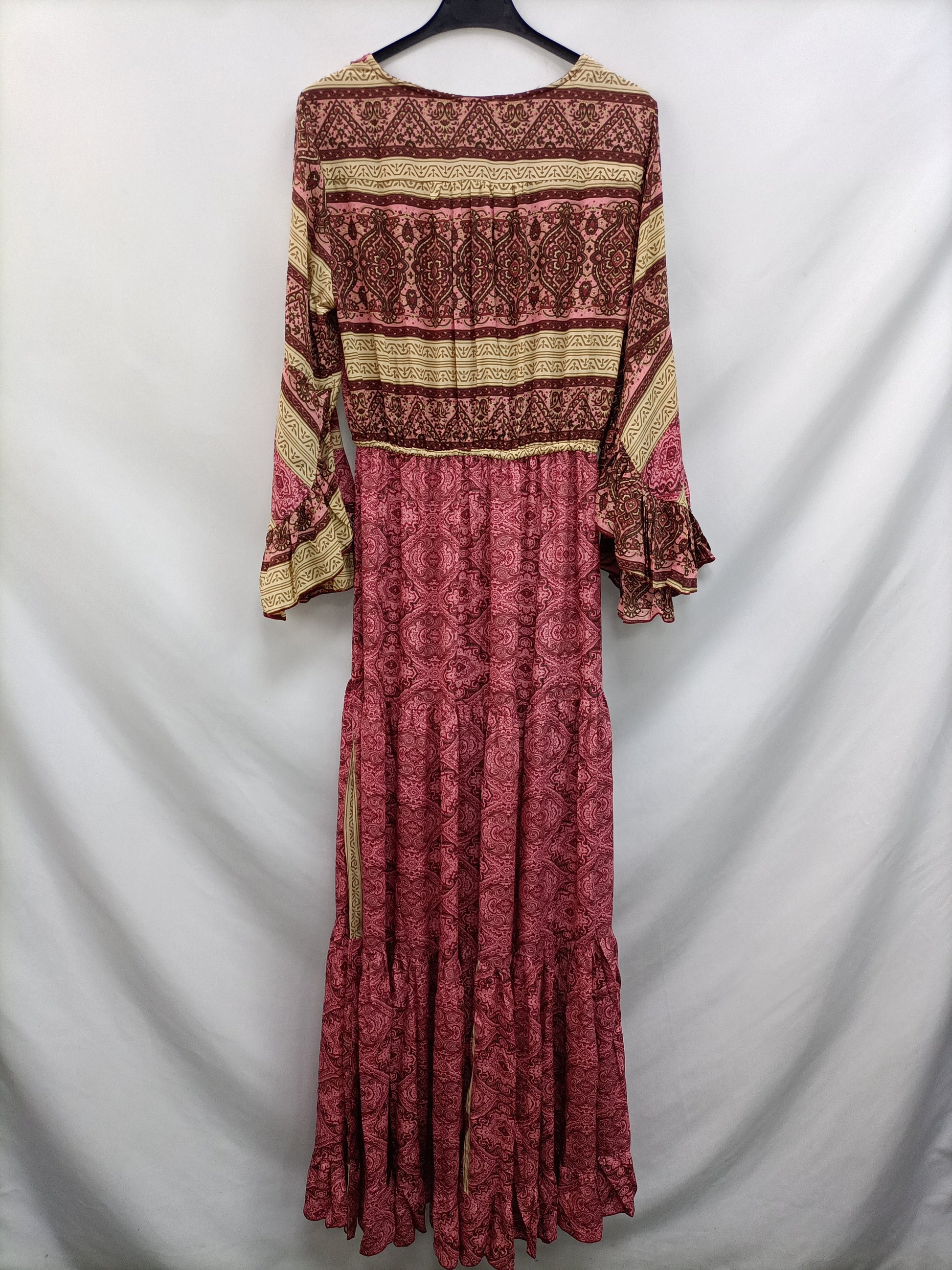 NUEVO CON ETIQUETA. Vestido largo en tonos rosas y beige estilo hippie. De sisa a sisa 52 cm Largo 148 cm