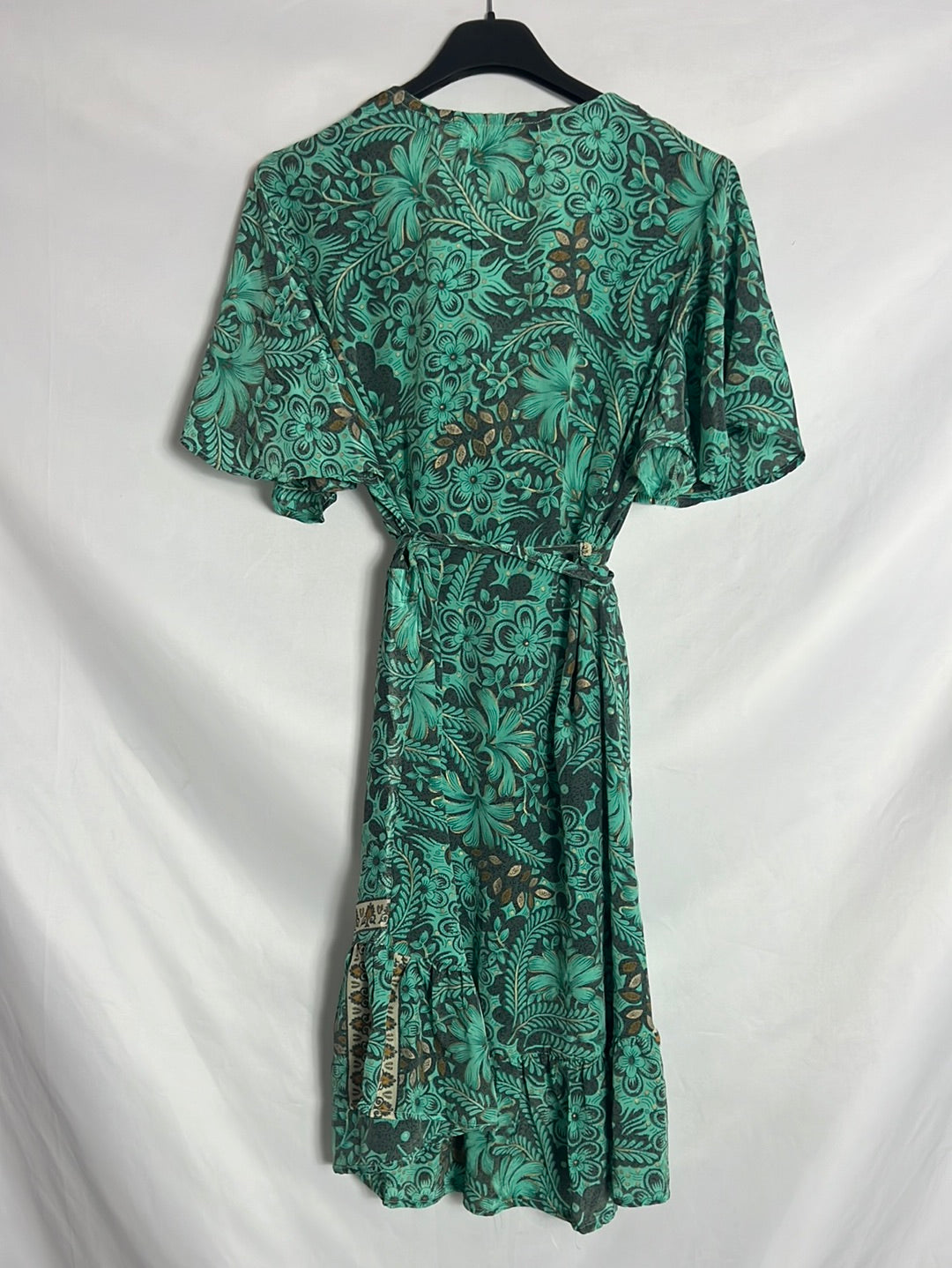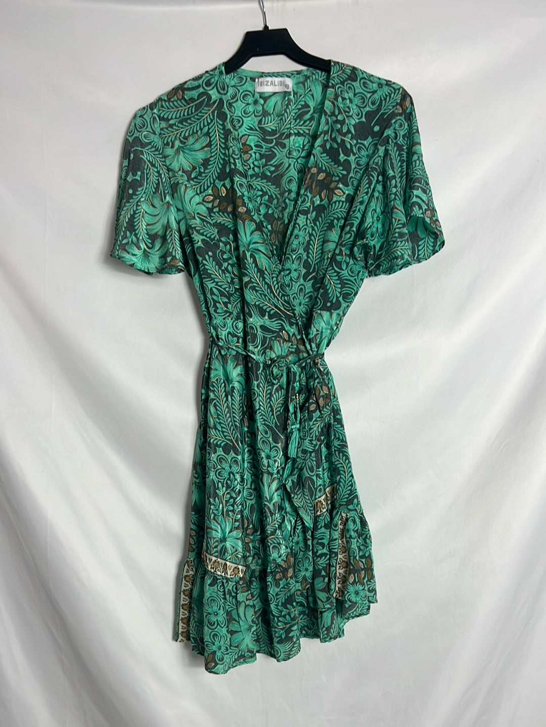 IBIZALIBI. Vestido verde corto cruzado estampado. T S/M