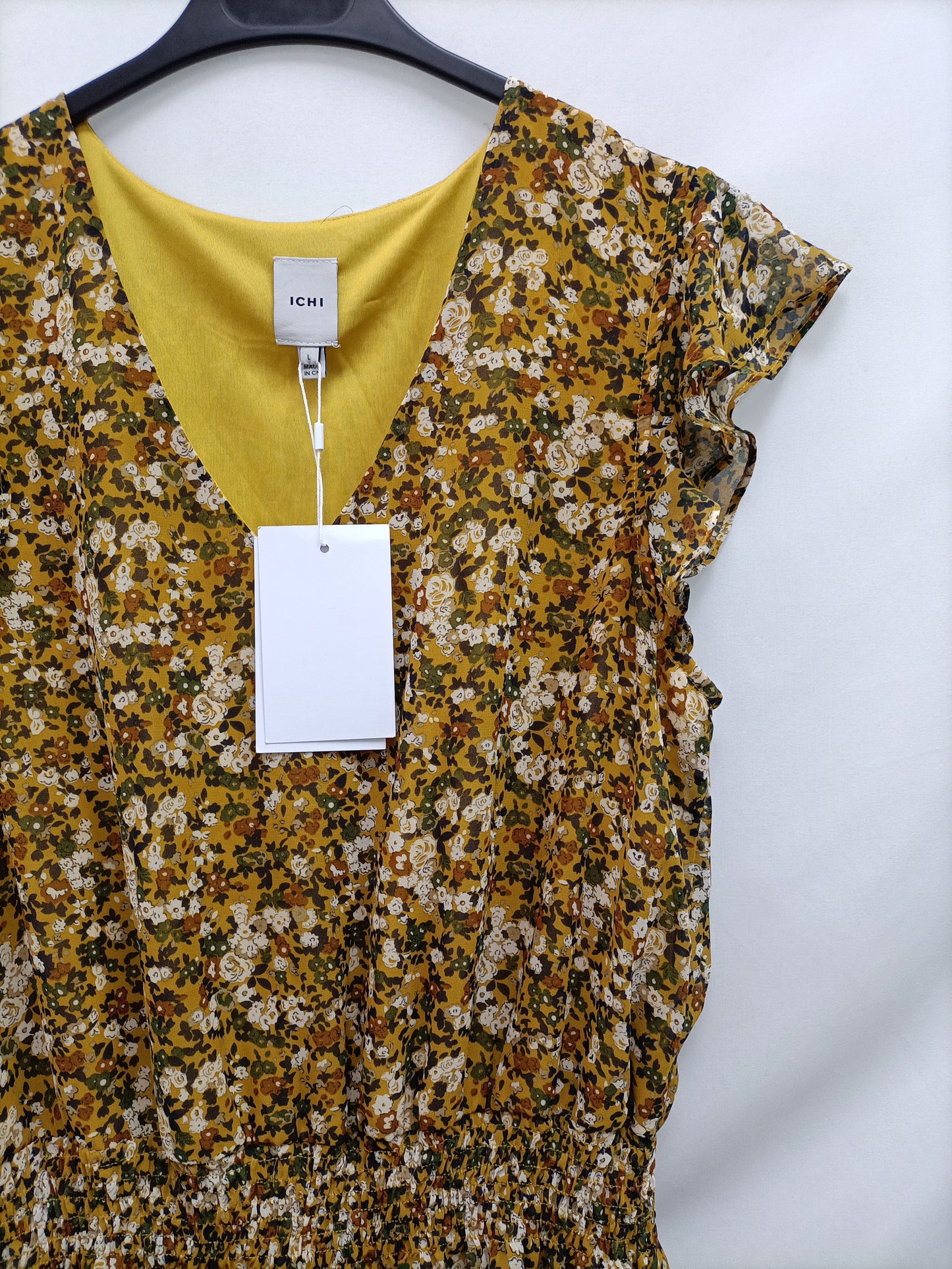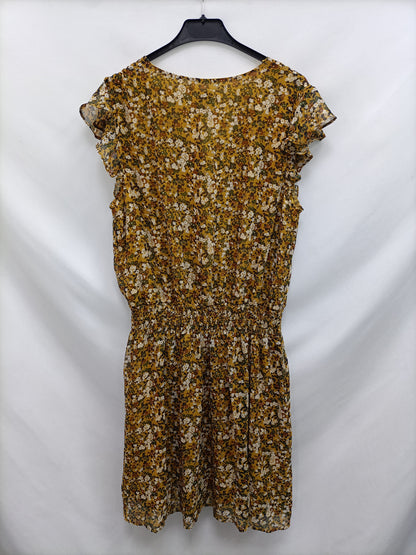 NUEVO CON ETIQUETA. Vestido de flores en tonos mostaza y marrones. Cintura elástica. Fluida. De sisa a sisa 52 cm largo 100 cm