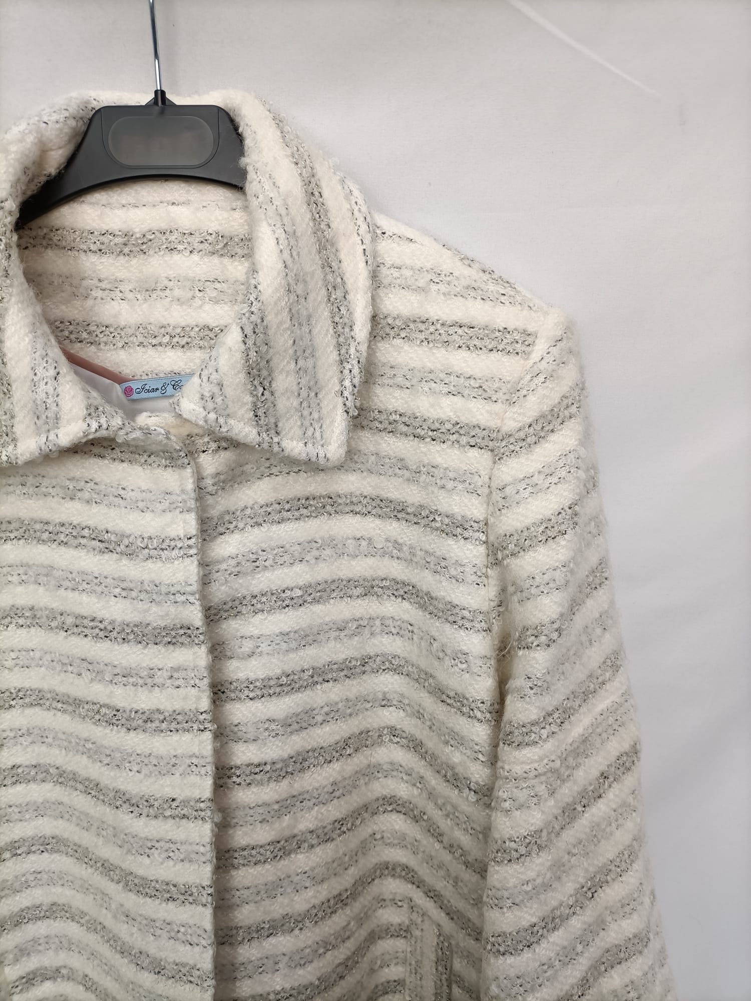 Iciar y candela. 44. Abrigo beige con rayas en tonos grises y detalle de hilos dorados. Se abrocha con botones de clip, tienes las mangas acampadas y no es elástico. De sisa a sisa 52 cm largo 87 cm