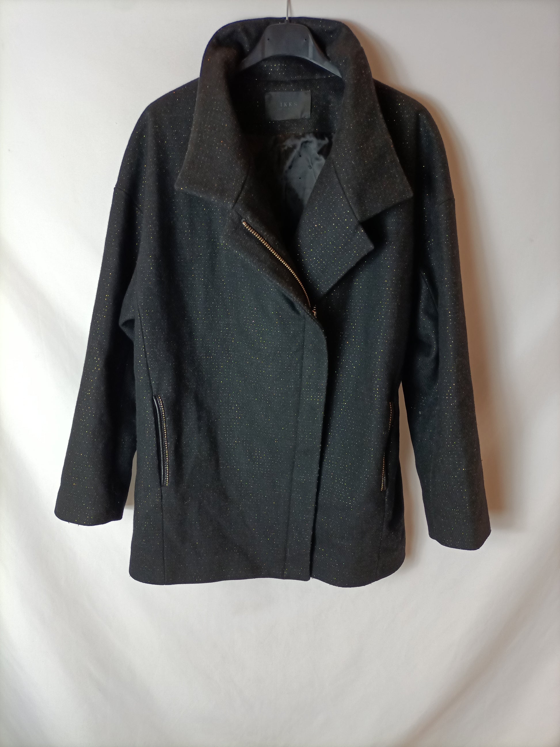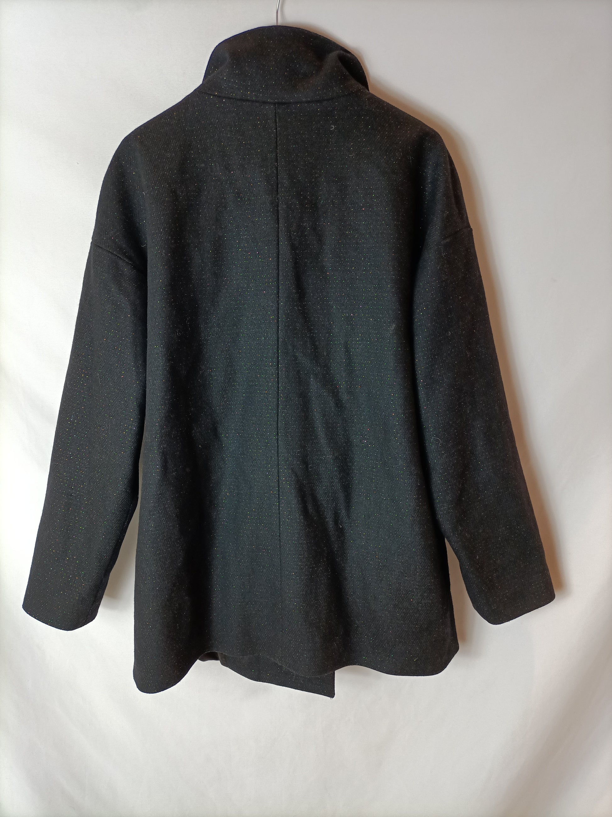 Abrigo de lana negro con hilos dorados. y cierre con cremallera.