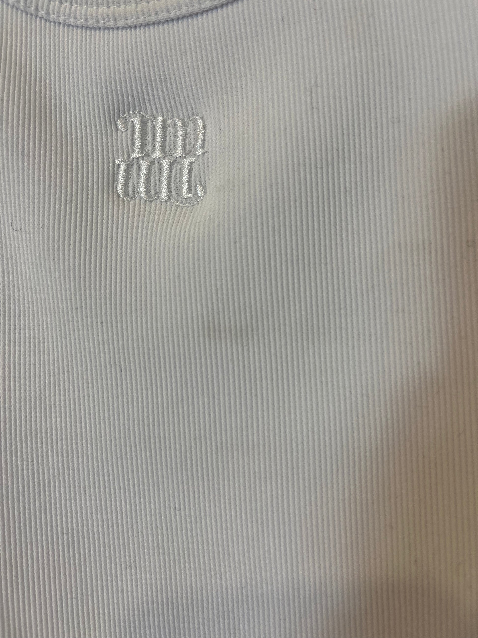 Tara: mancha poco perceptible. top blanco canalé entallado.