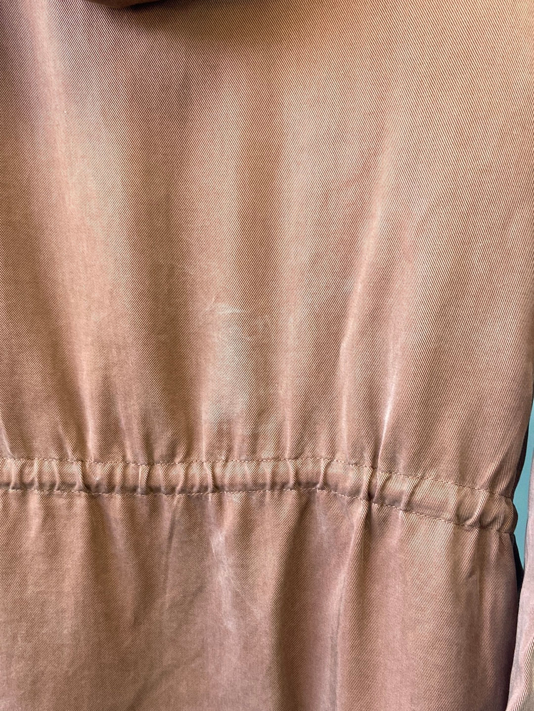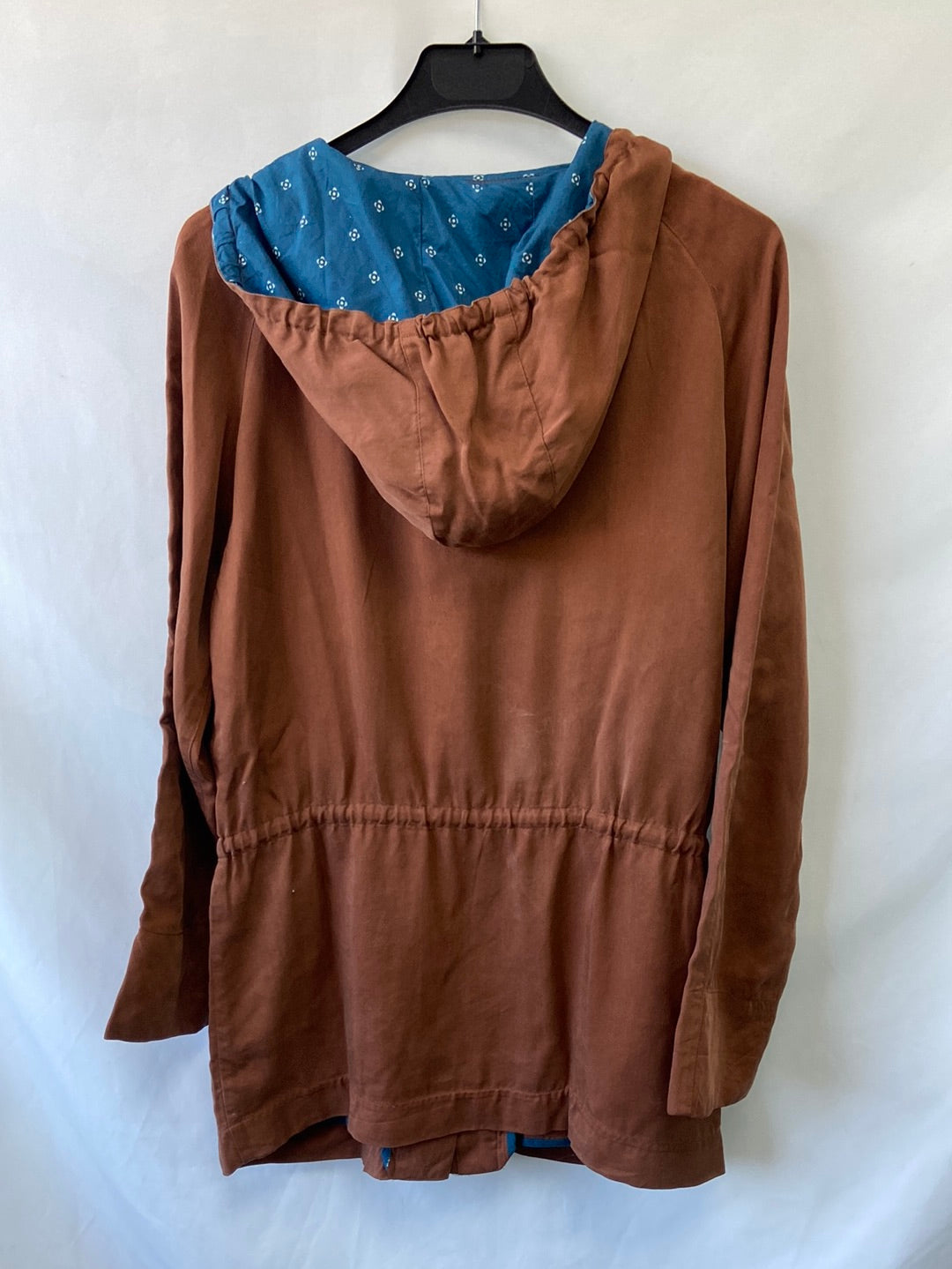 abrigo tipo parka marrón con capucha. Elástico en la cintura. Tara: tiene una zona por detrás un poco desgastada .