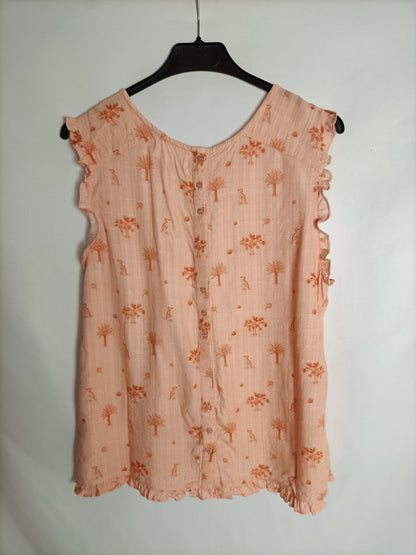 top rosa salmón con estampado de estampado de palmeras y patos. volantentitos en la mangas.