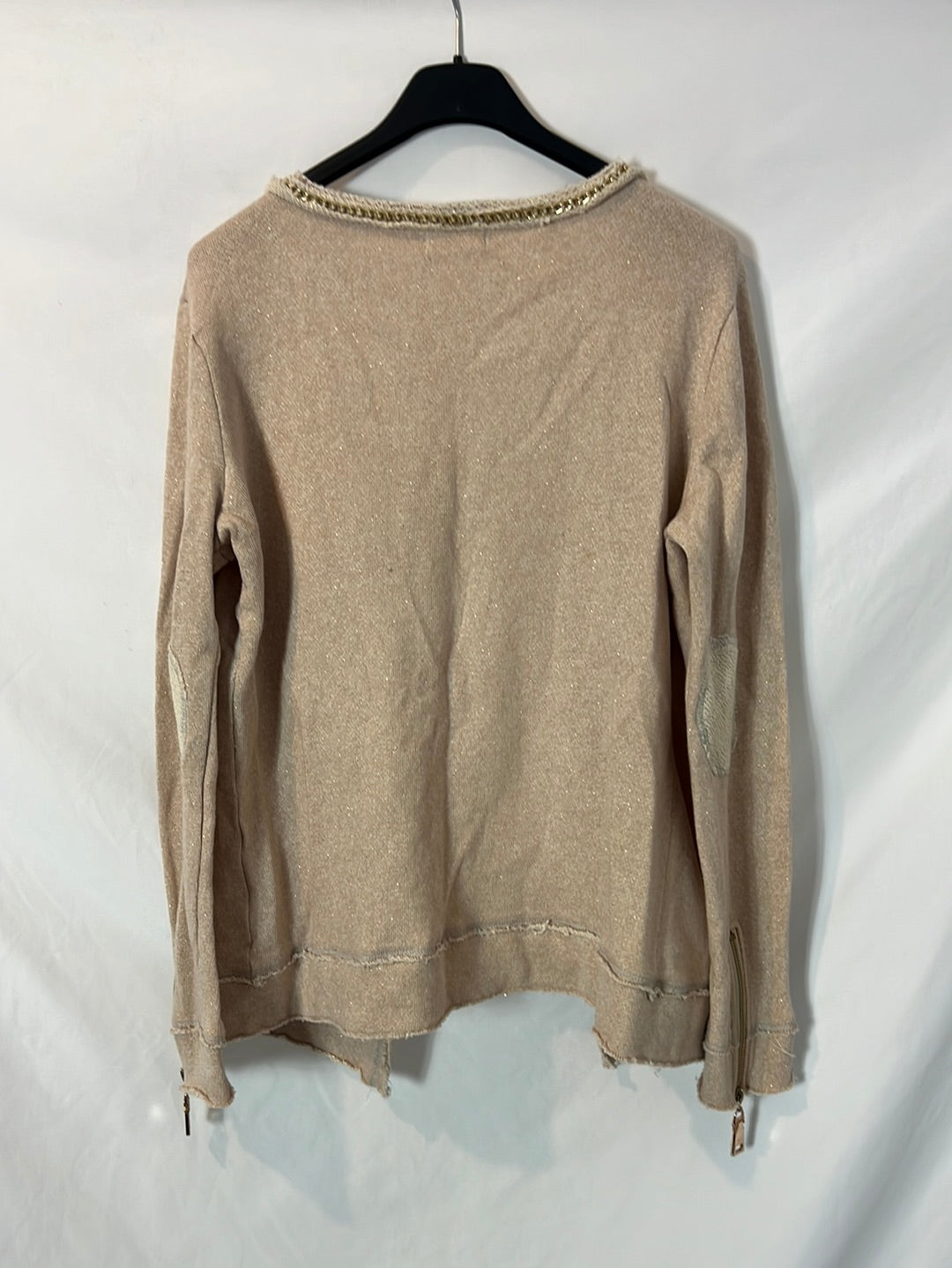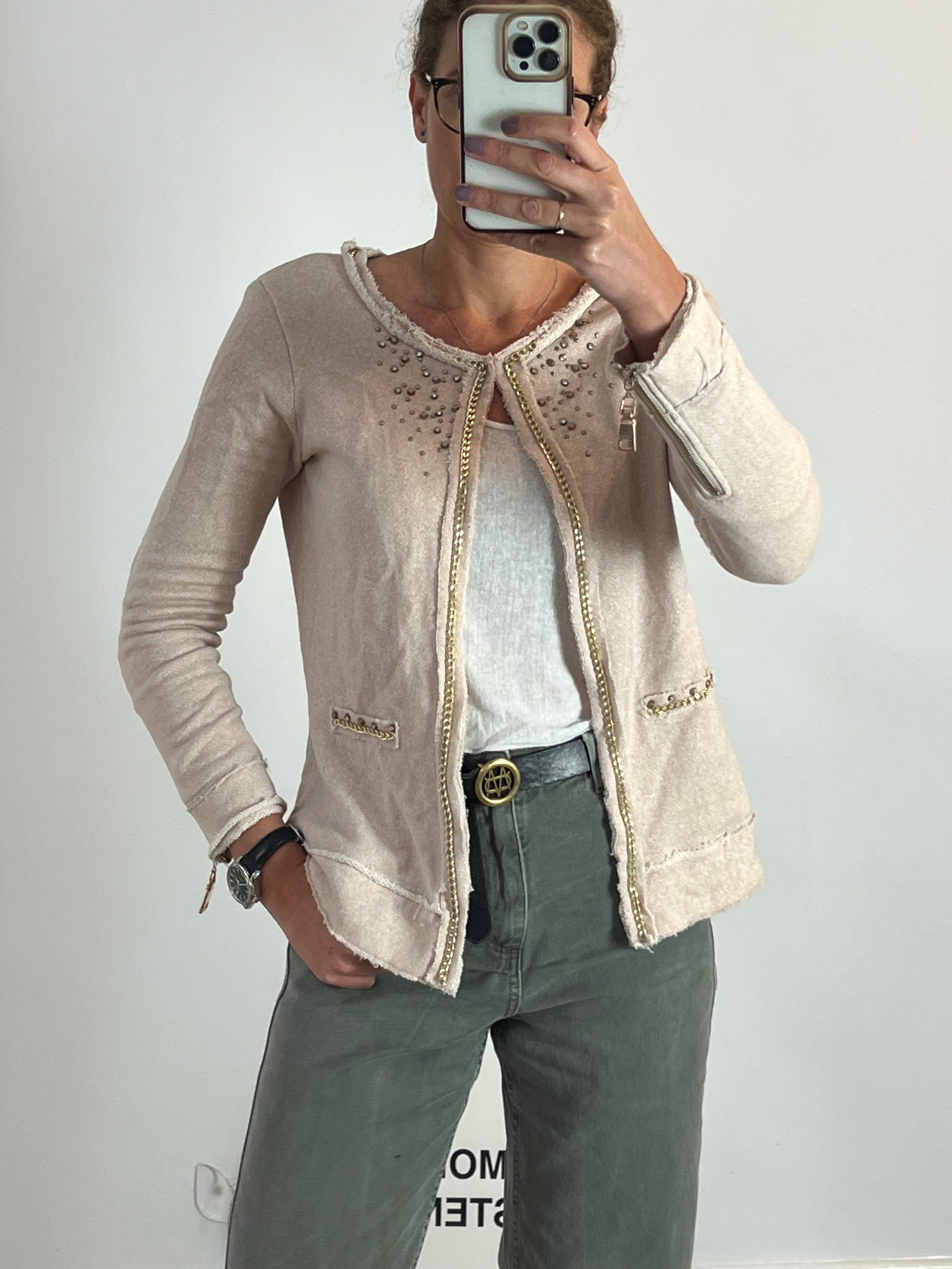 NUEVO CON ETIQUETA. Chaqueta rosa palo elástica con detalle de abalorios y cadena dorada. Hombros 42cm, de sisa a sisa 53cm, largo 57cm