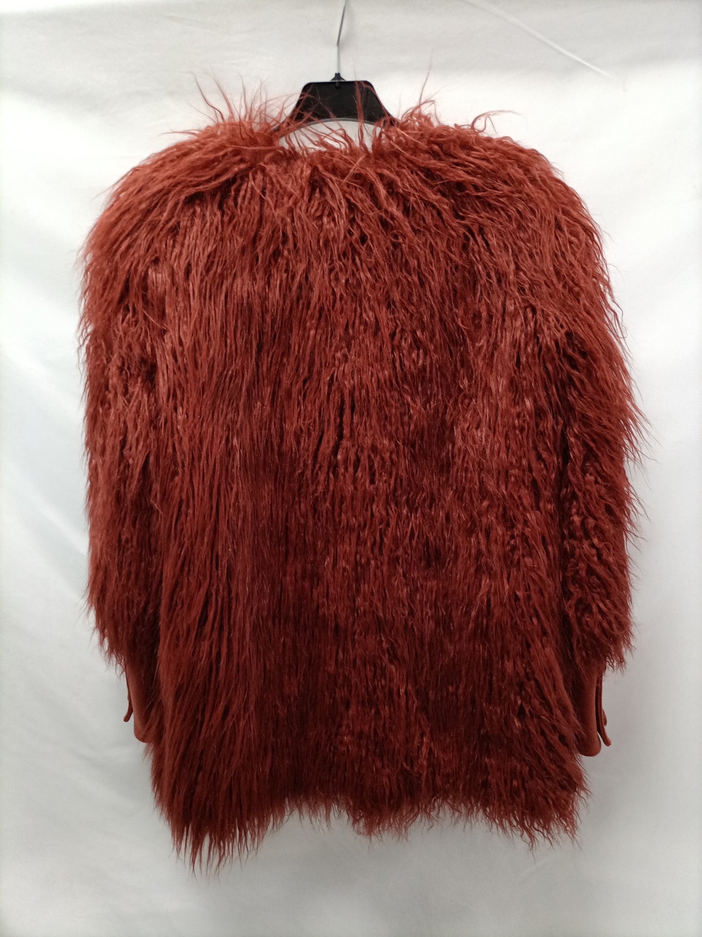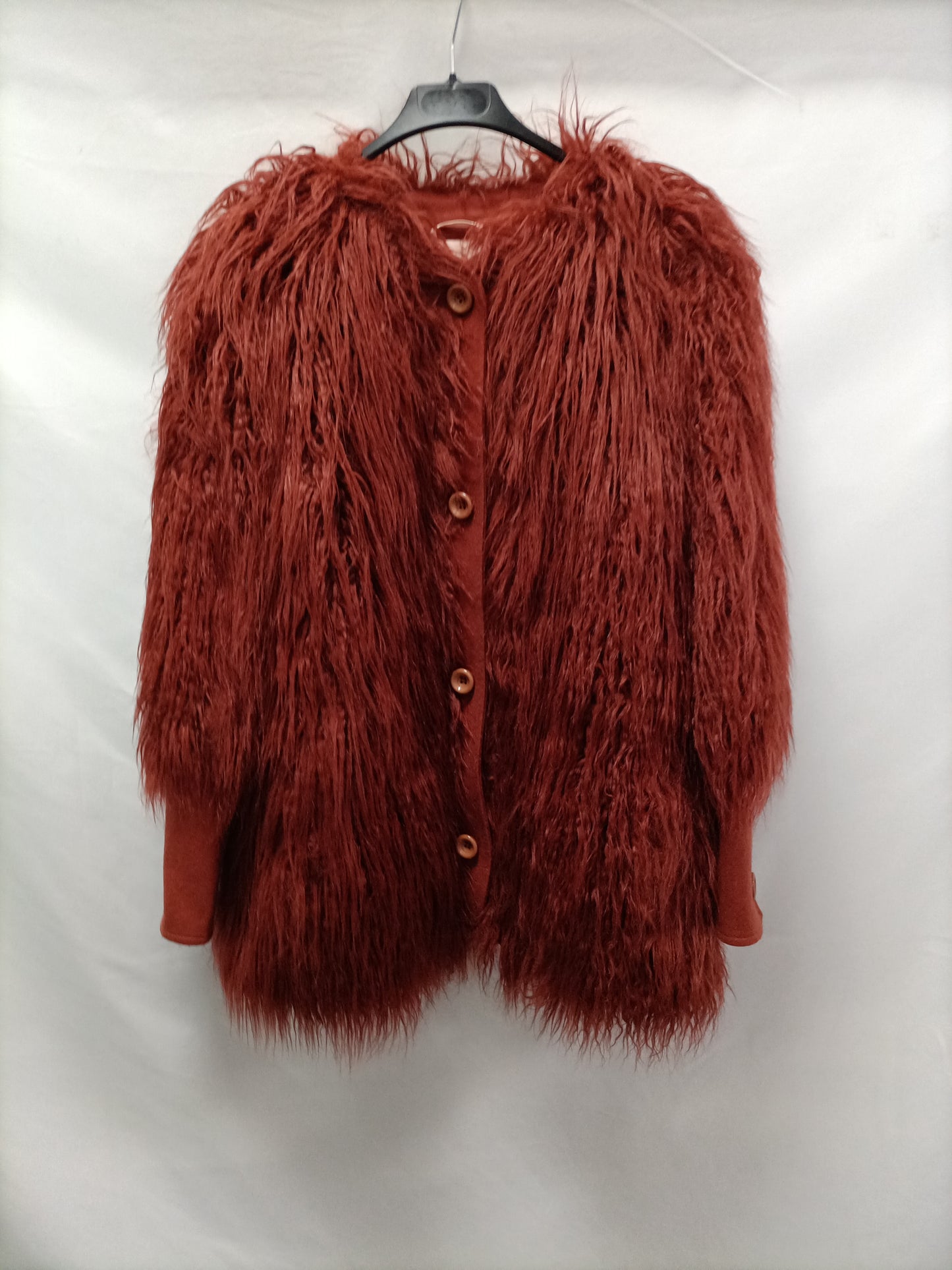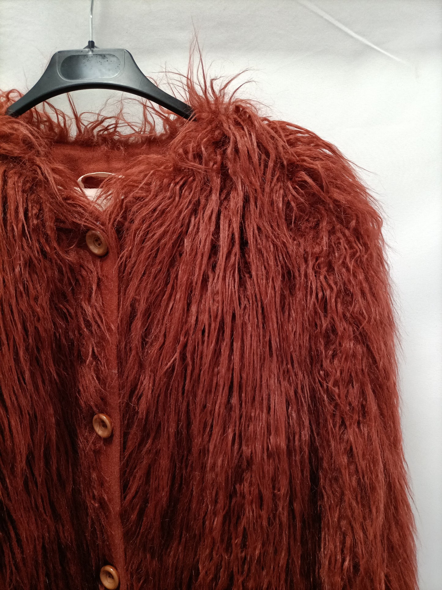 Abrigo de pelo color teja con los puños y la zona de los botones en paño. El interior es tipo plumas