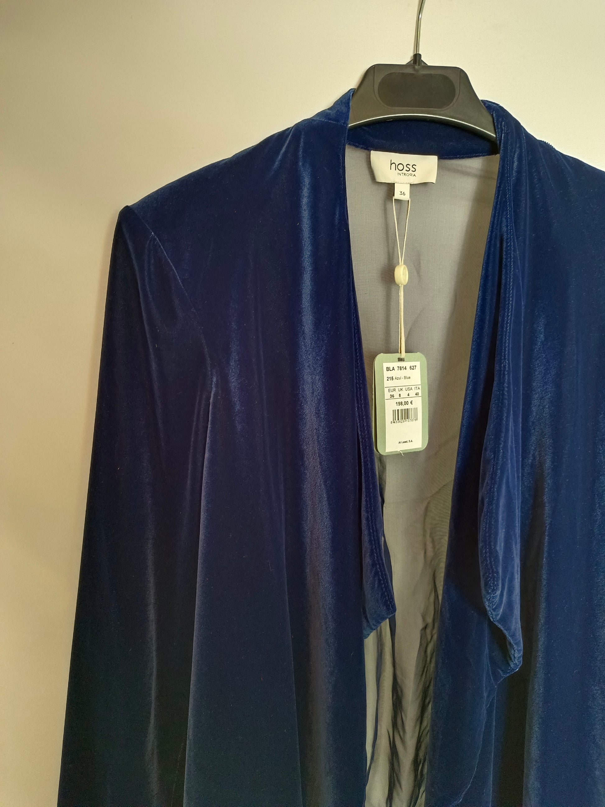 NUEVO CON ETIQUETA. Blazer azul de terciopelo con la espalda transparente. De sisa a sisa 44 cm largo 66 cm