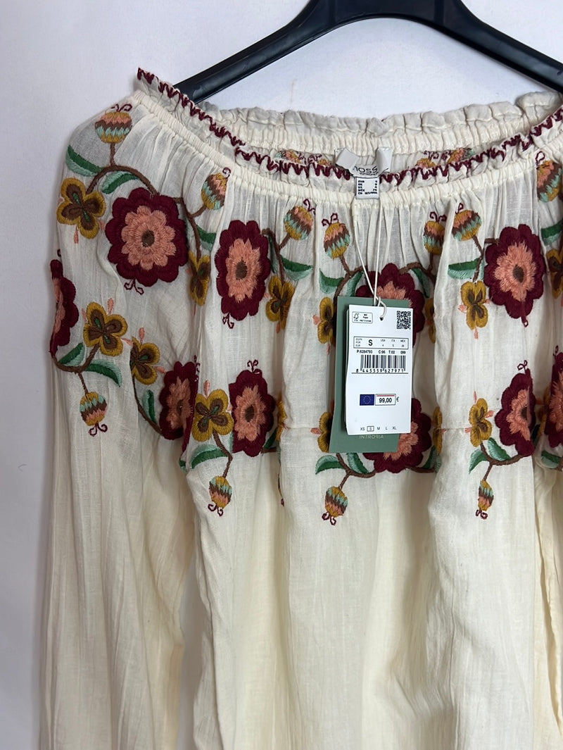 NUEVO CON ETIQUETA. Blusa beige bordada