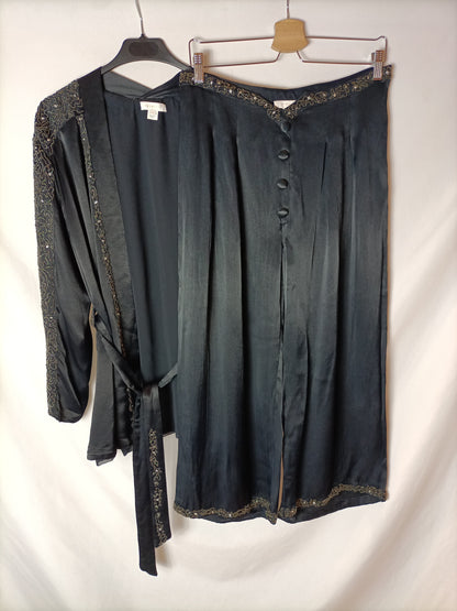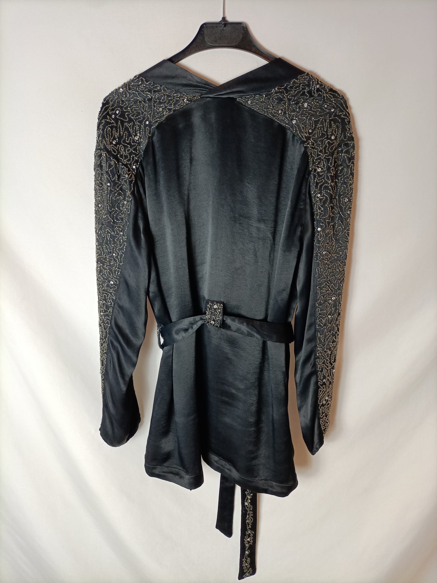 Chaqueta negra fluida pedrería con cinturón opcional. Tejido satinado no elástico
