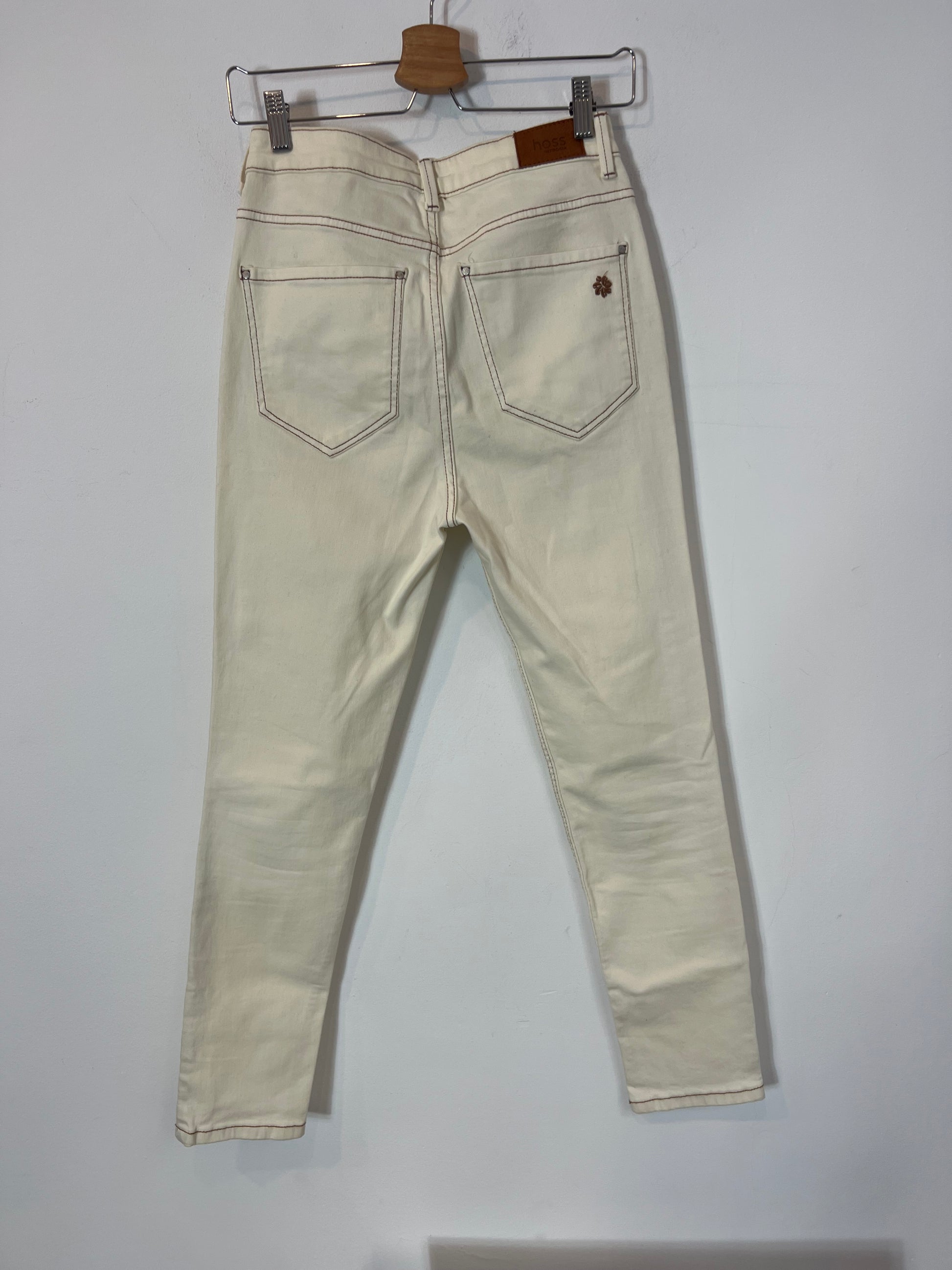 Pantalón beige denim pitillo con detalle de costuras. Cintura 35 cm largo 101 cm
