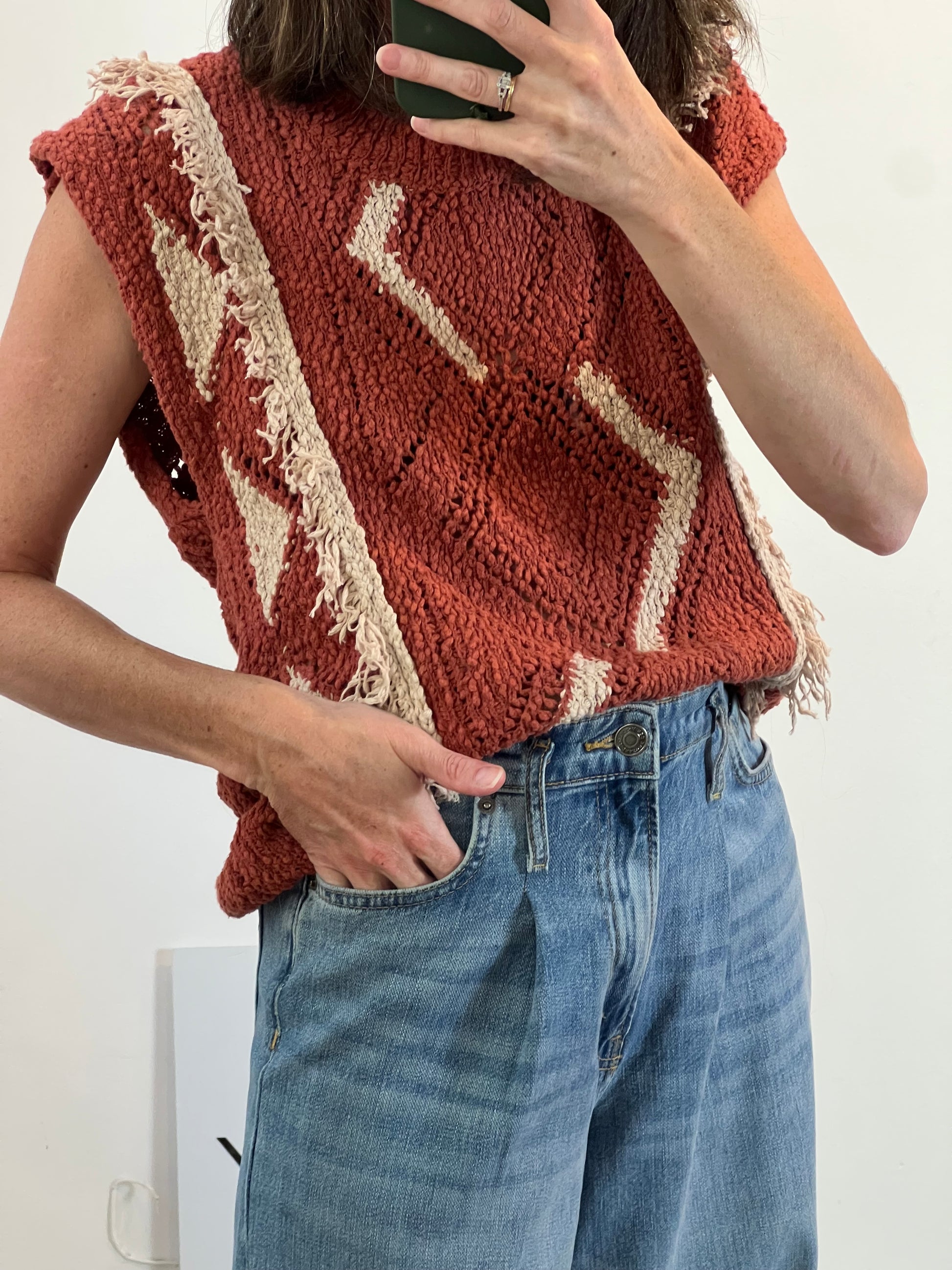 top punto teja y beige troquelado con flecos. Largo 58 cm