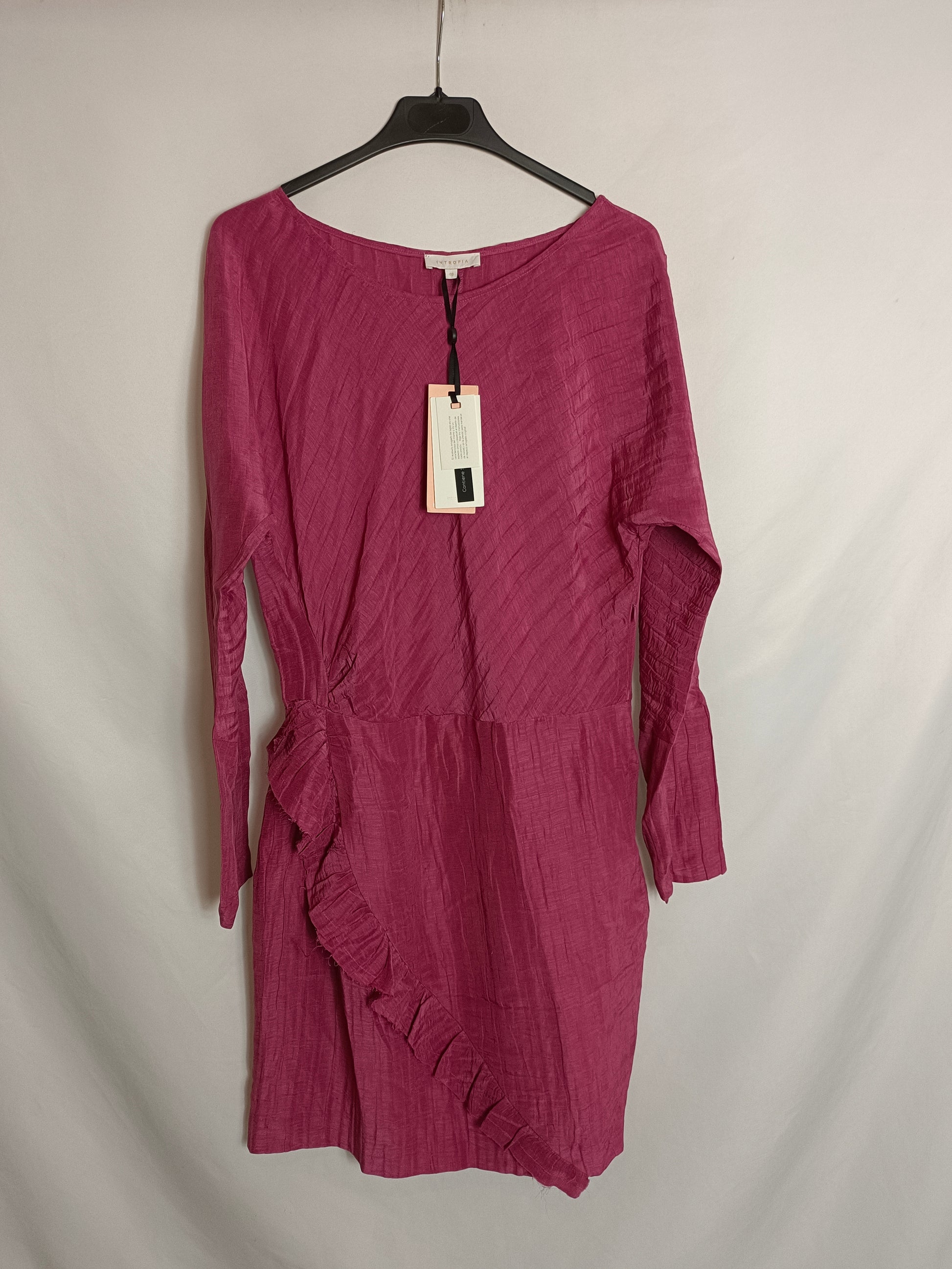 NUEVO CON ETIQUETA. Vestido corto rosa con falda cruzada. Lino y seda. De sisa sisa 50 cm largo 91 cm