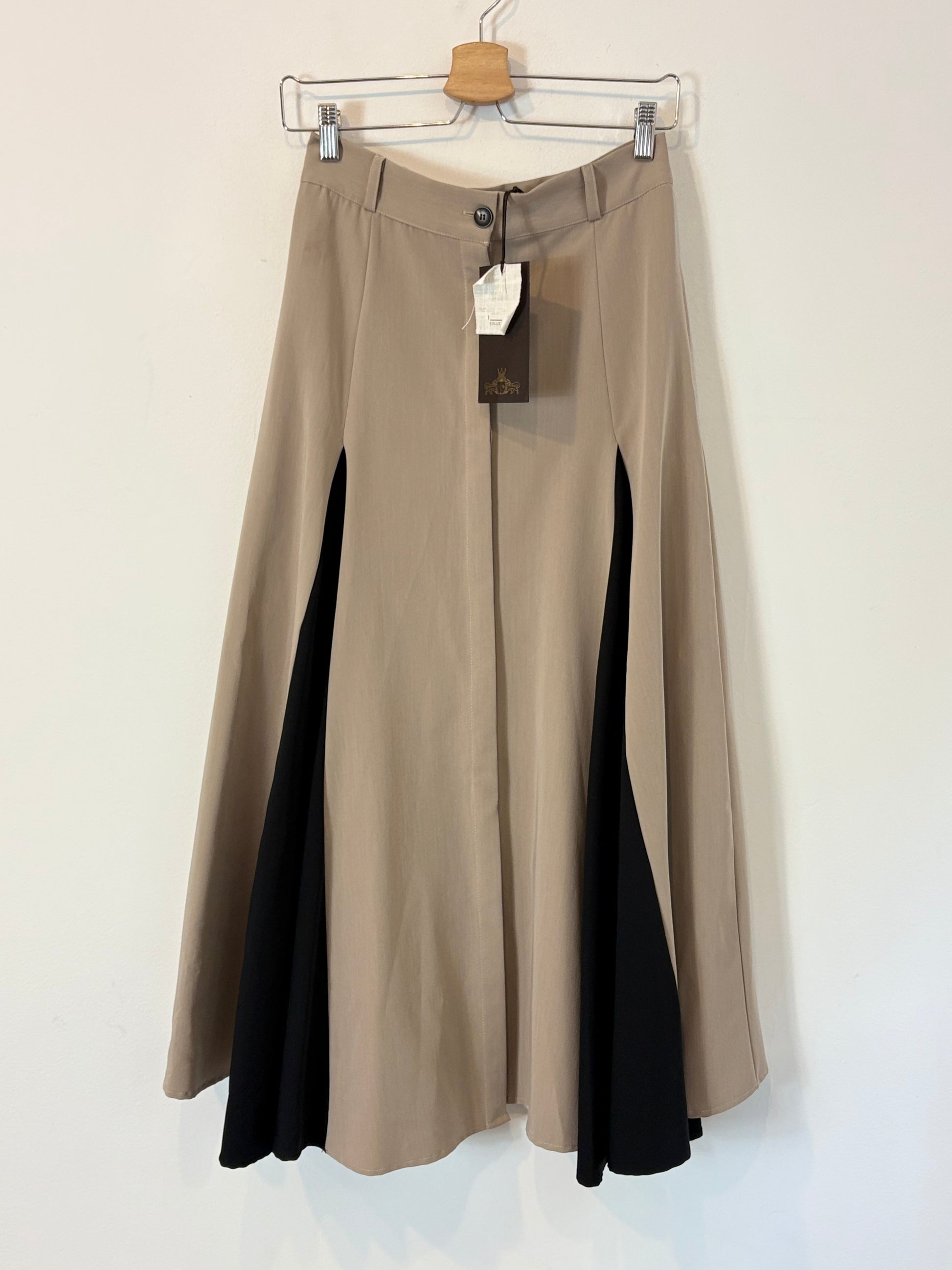 NUEVO CON ETIQUETA. Falda vuelo beige tostado y negra. Cintura 37 cm, largo 91 cm