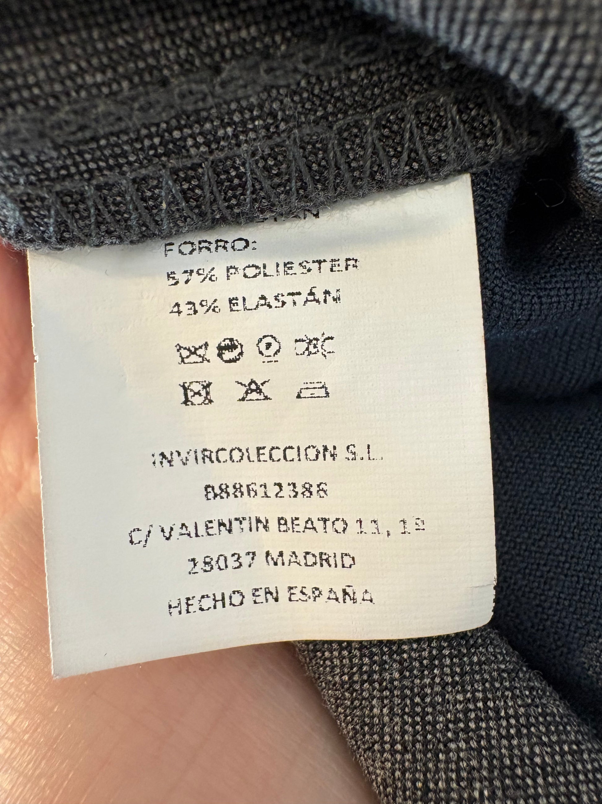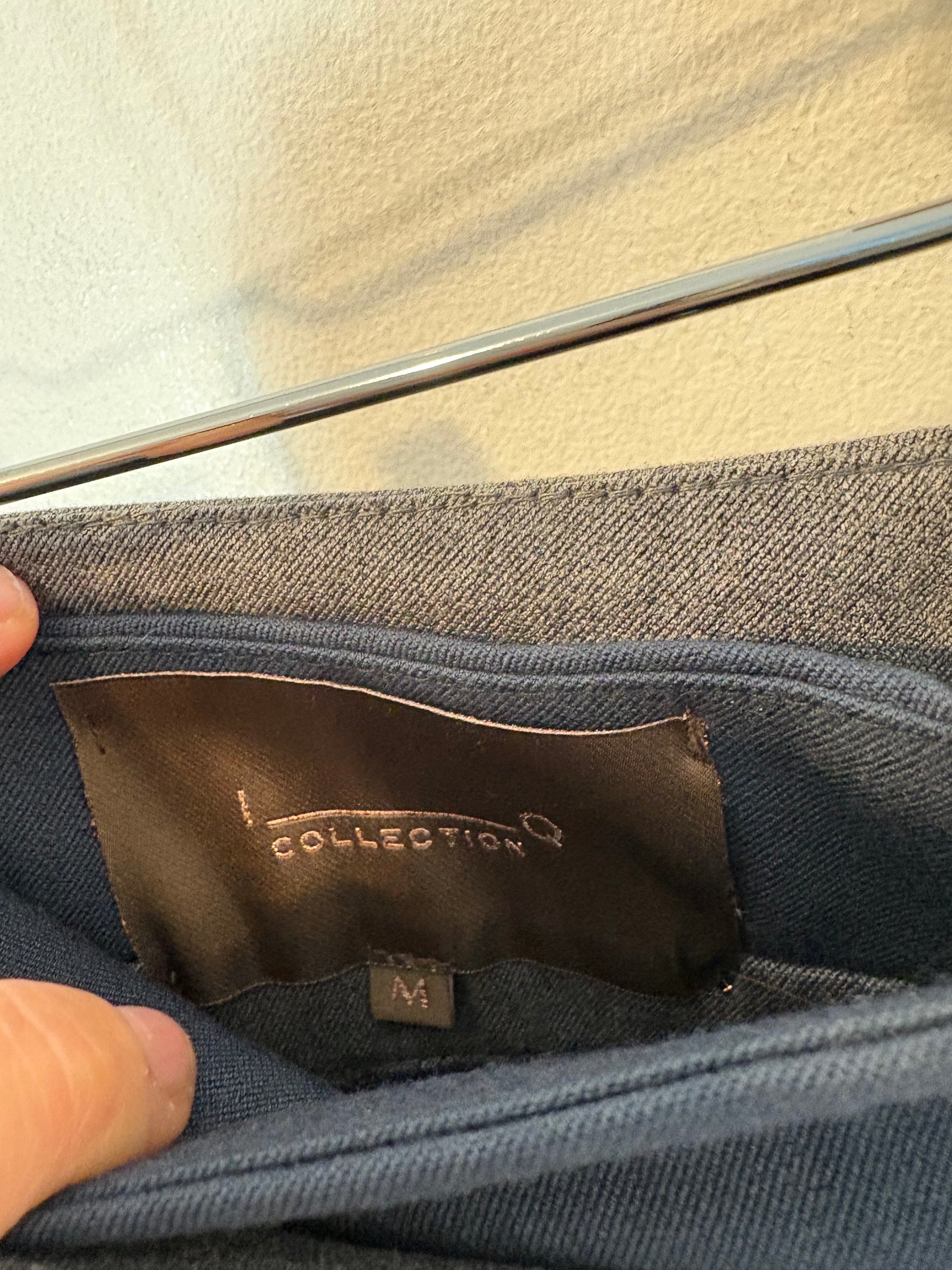 Cintura 37 cm, largo 91 cm. No elástico. Azul marino y gris