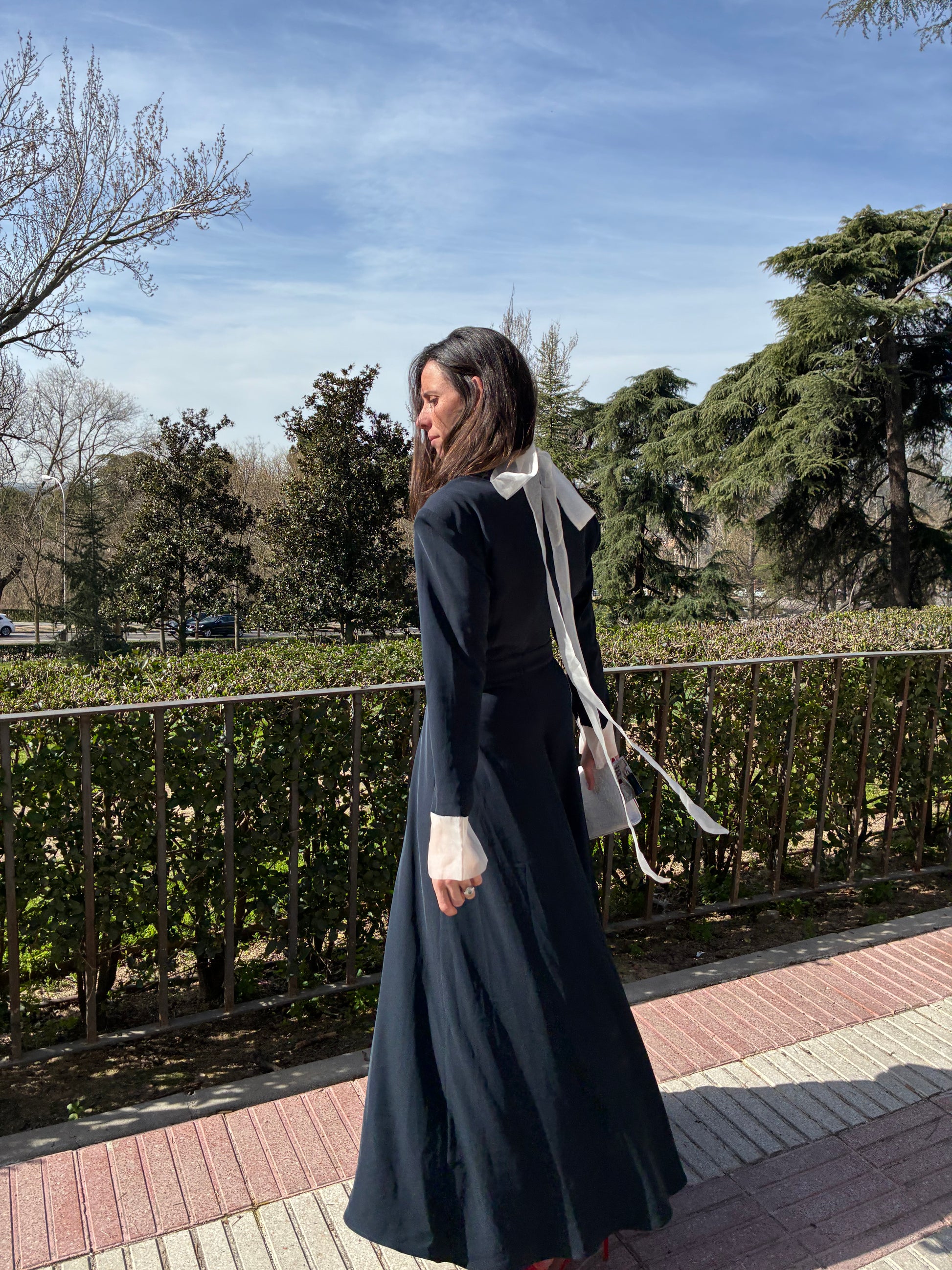 Talla como una s/m. Hombros 46 cm, Espalda 47 cm ,cintura 35,5 cm , largo 143 cm/ zona del escote hilos un poco dados de muy poco visible (foto€