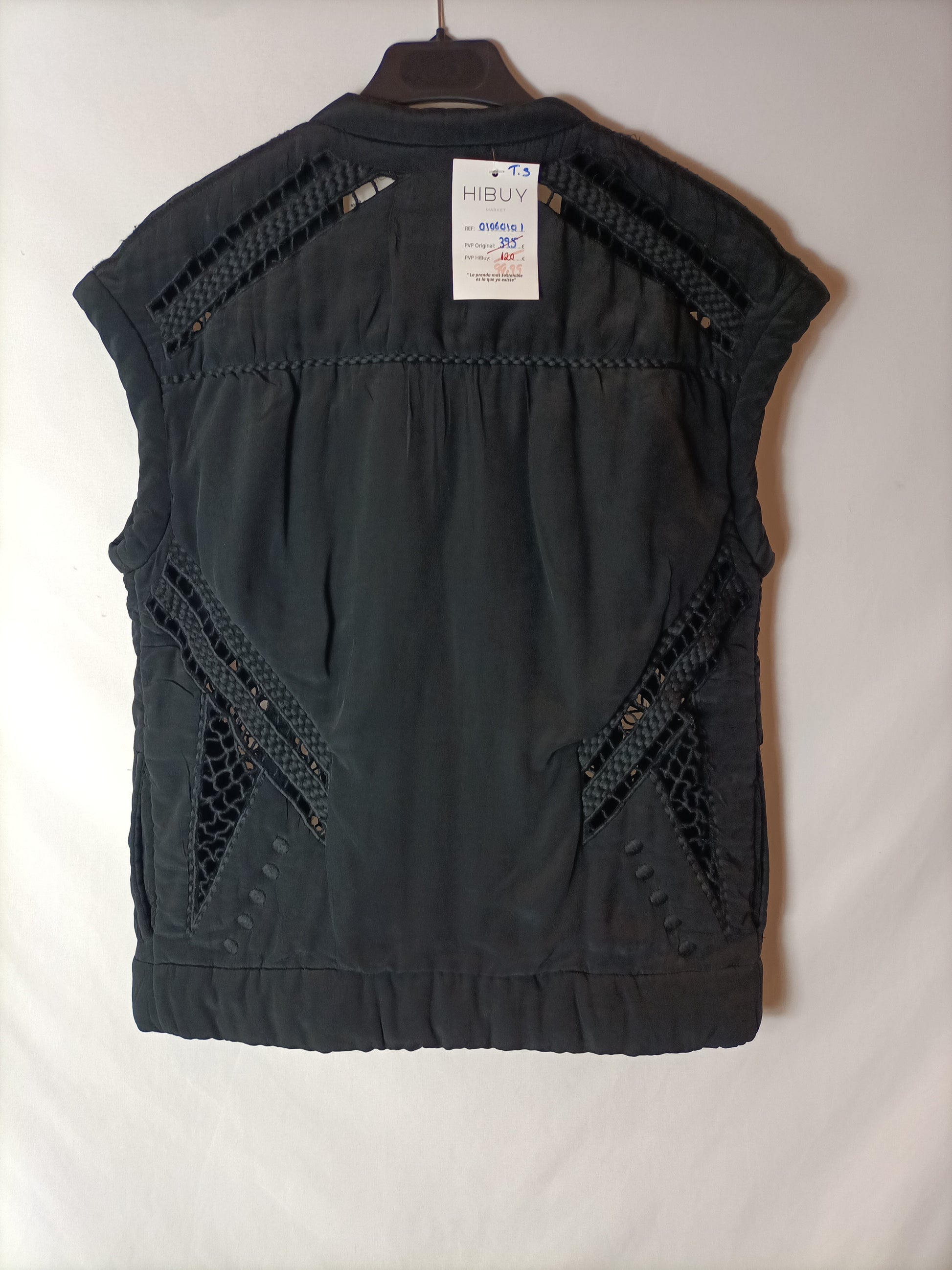 Chaleco negro troquelado . Híñenos 49cn, de sisa a sisa 46cm, largo 61cm