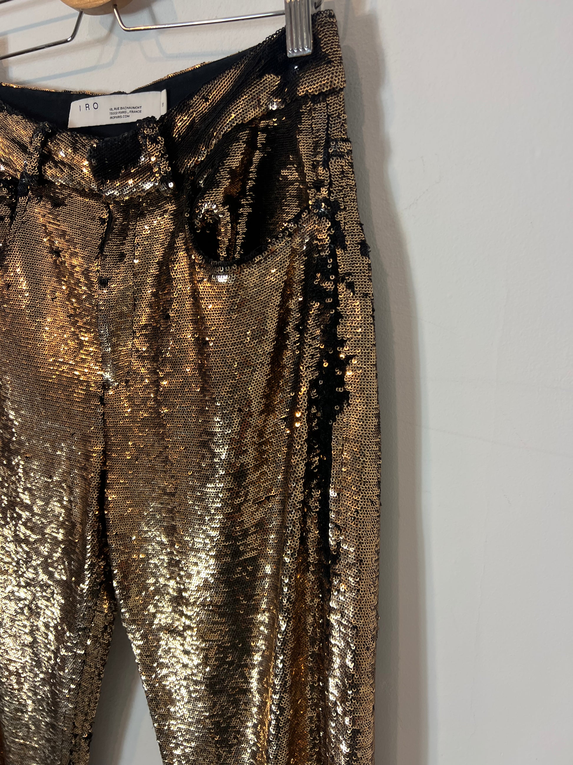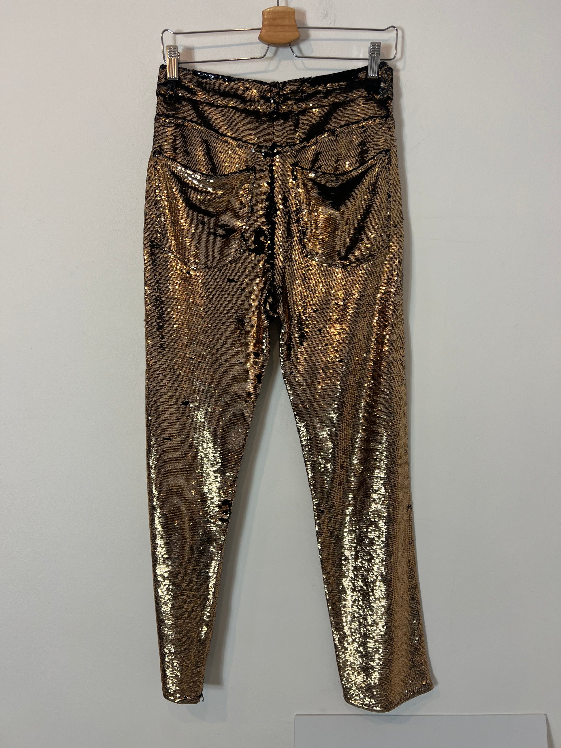 Pantalón recto de lentejuelas negros y dorado. No elástico. Cintura 37 cm largo 112cm