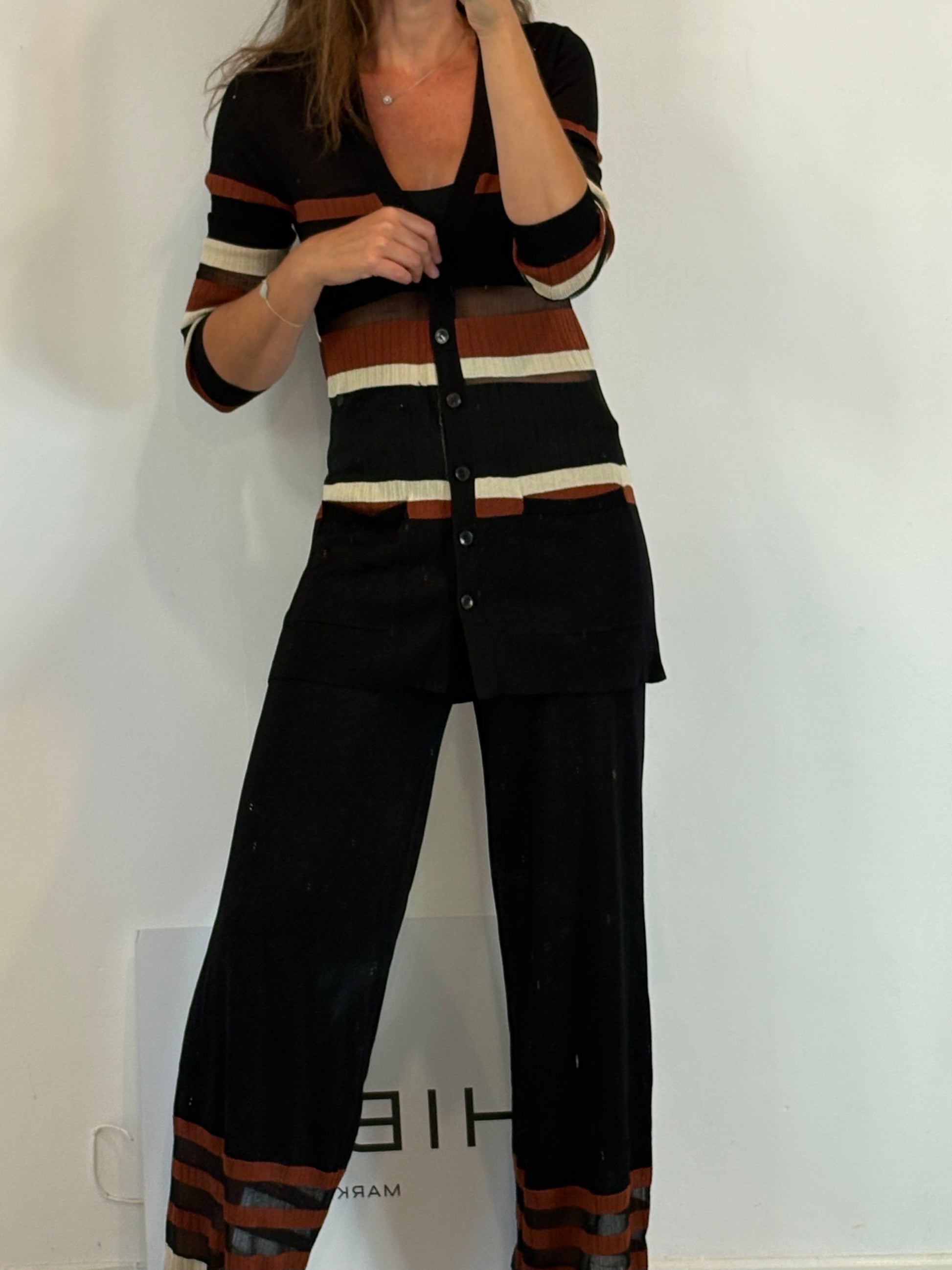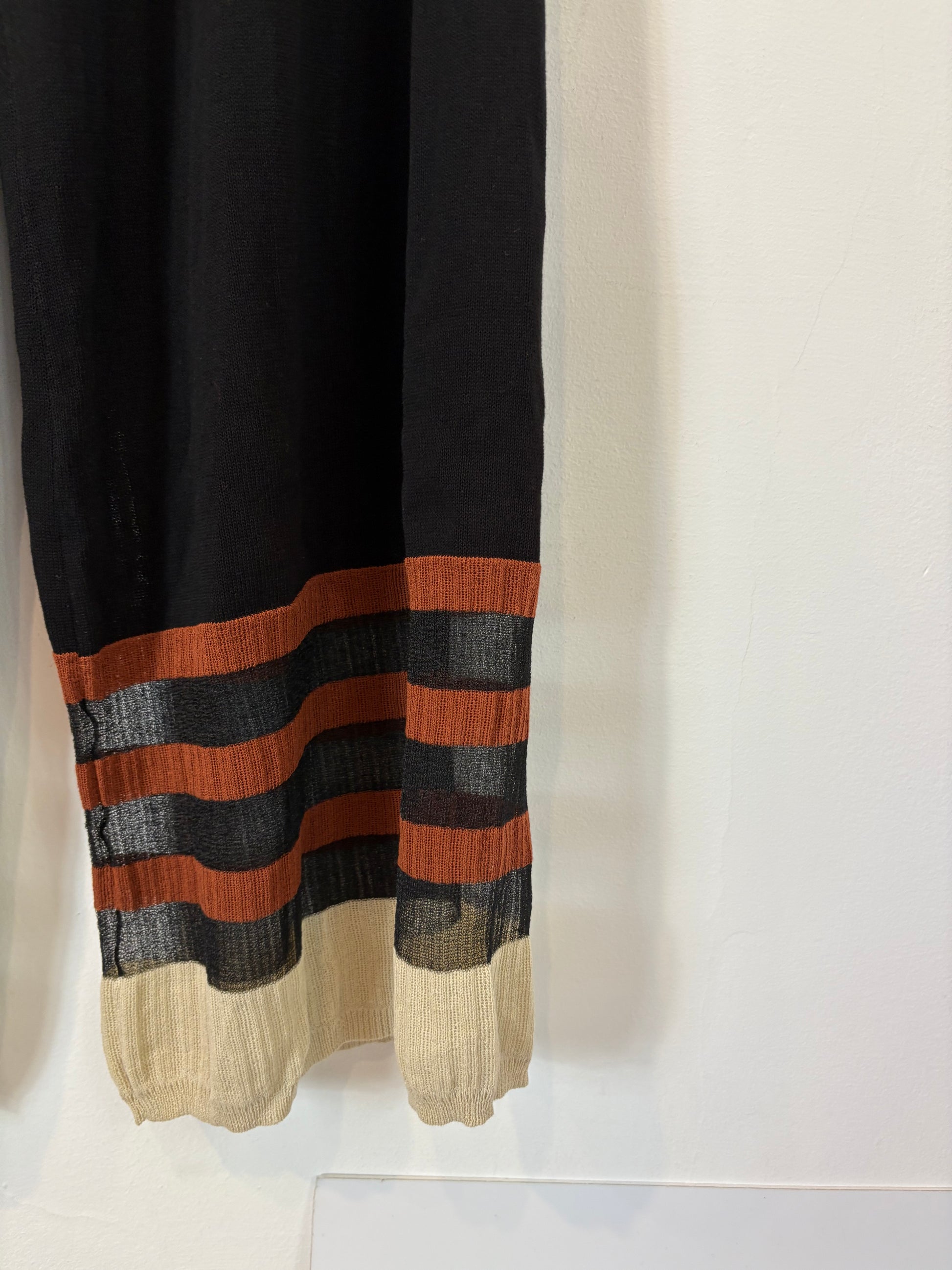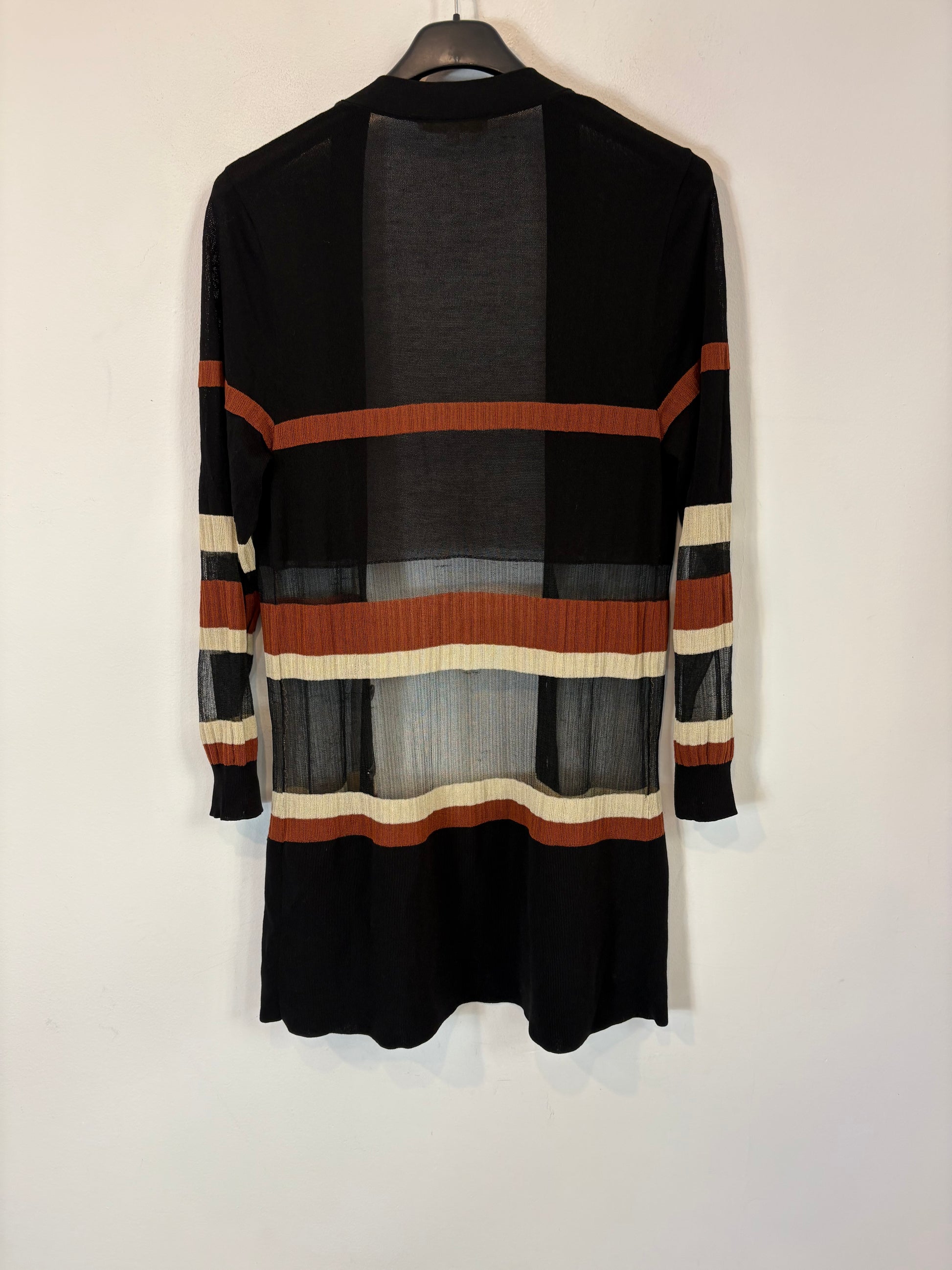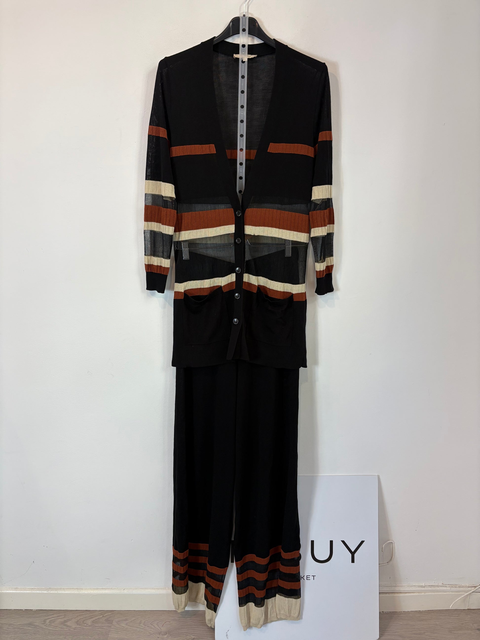 conjunto punto negro con rayas abajo y chaqueta larga abierta. de sisa a sisa 45 cm largo 88 cm. cintura 35 cm largo 113 cm