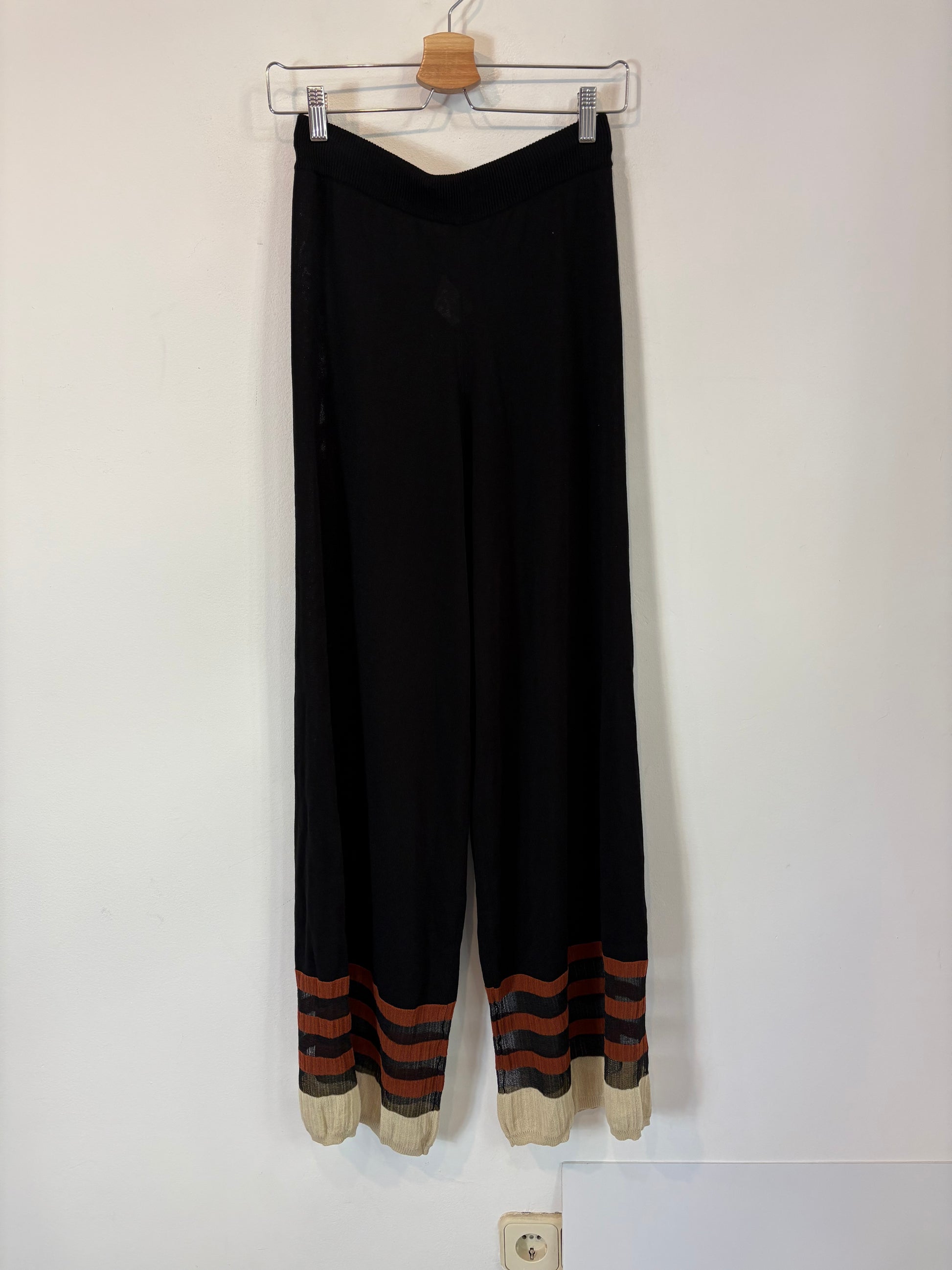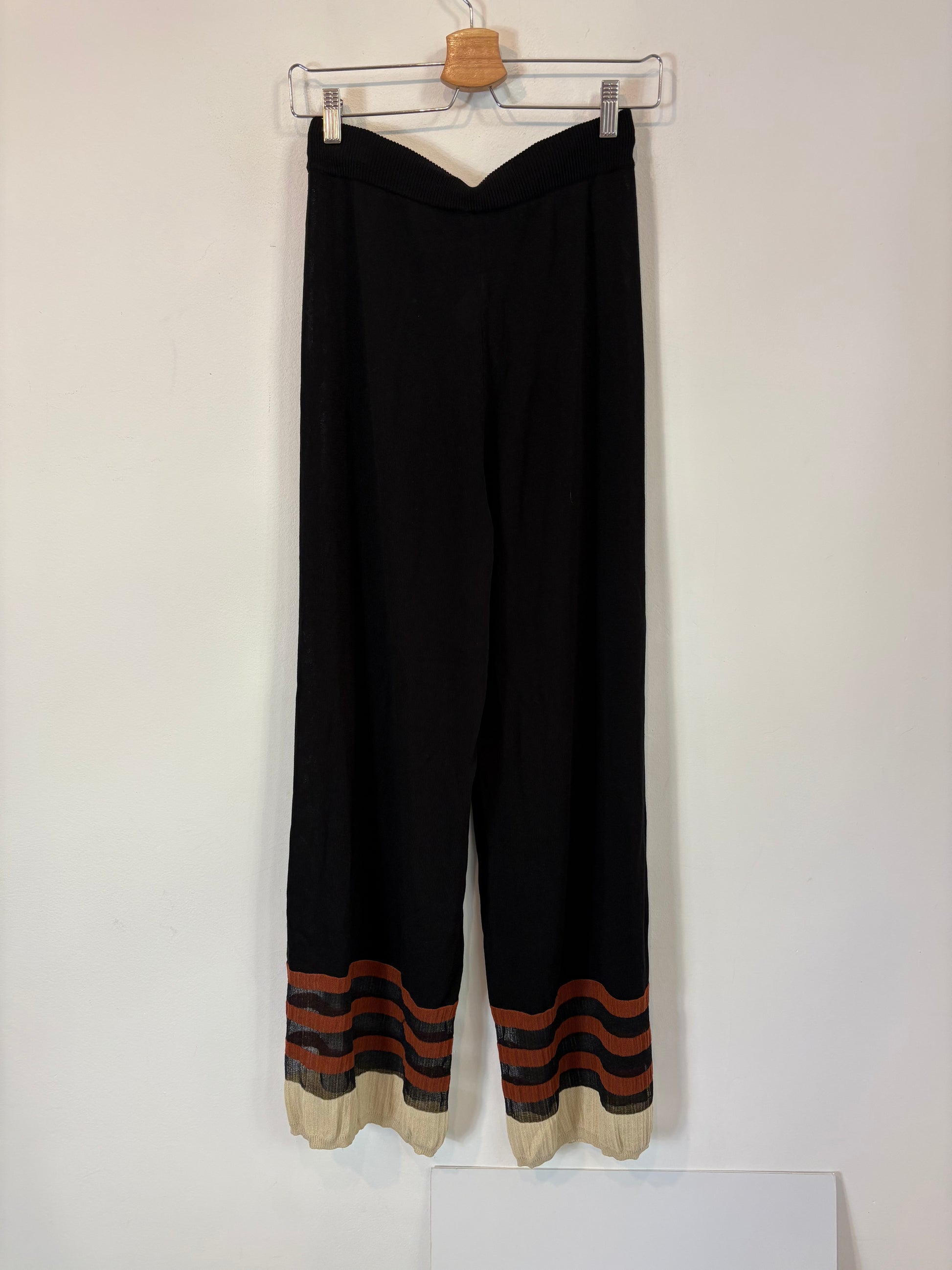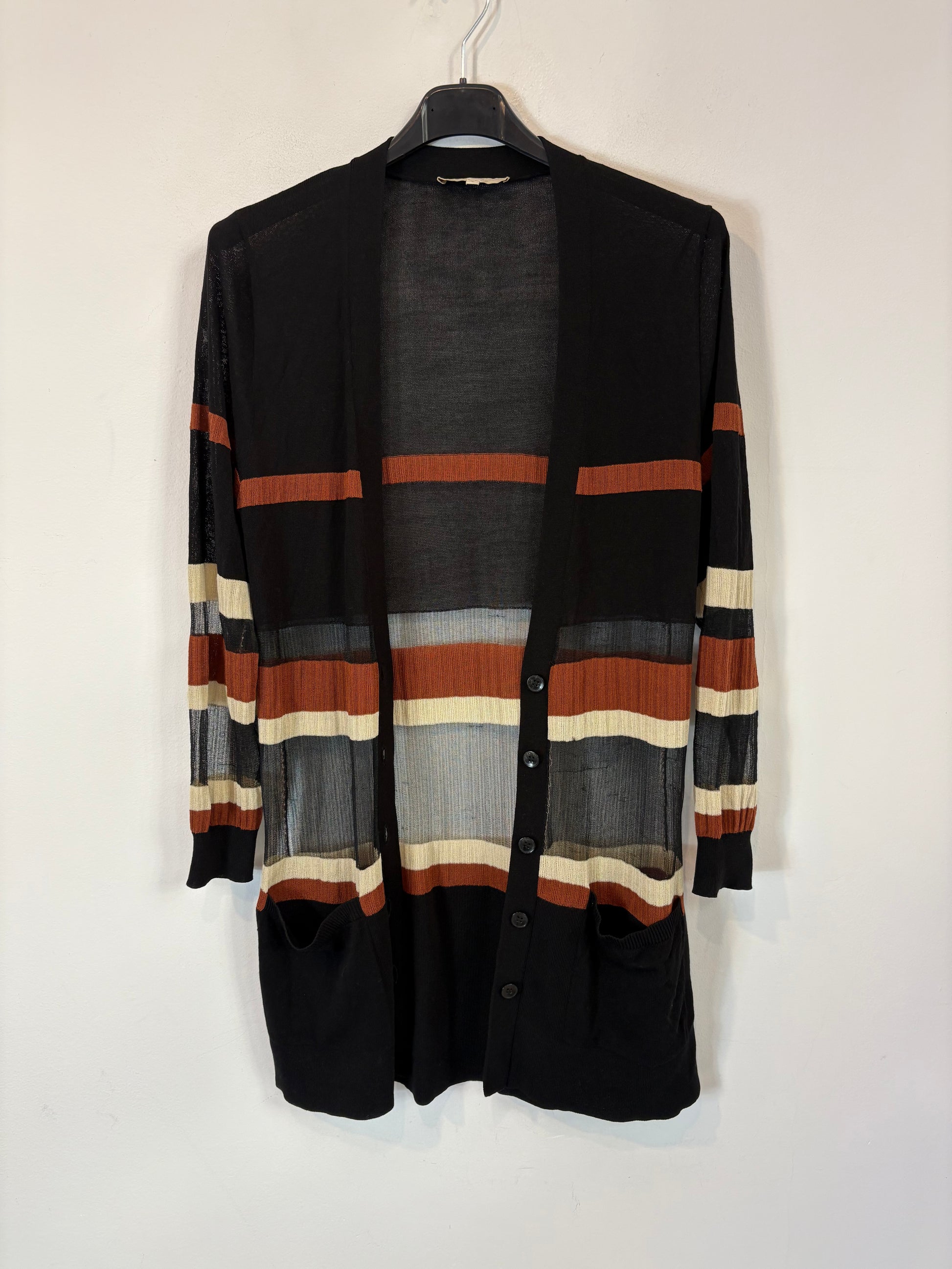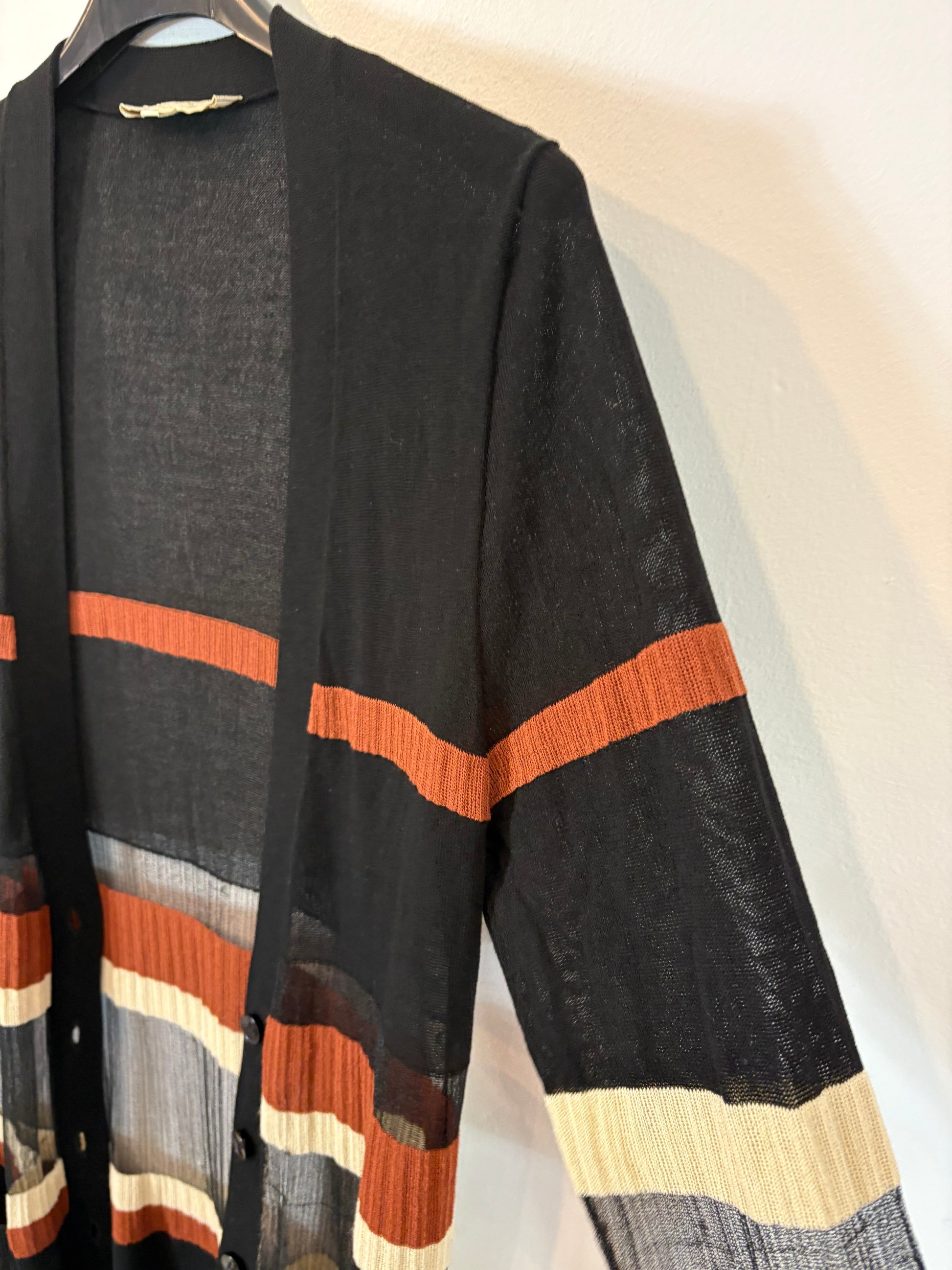 conjunto punto negro con rayas abajo y chaqueta larga abierta. de sisa a sisa 45 cm largo 88 cm. cintura 35 cm largo 113 cm
