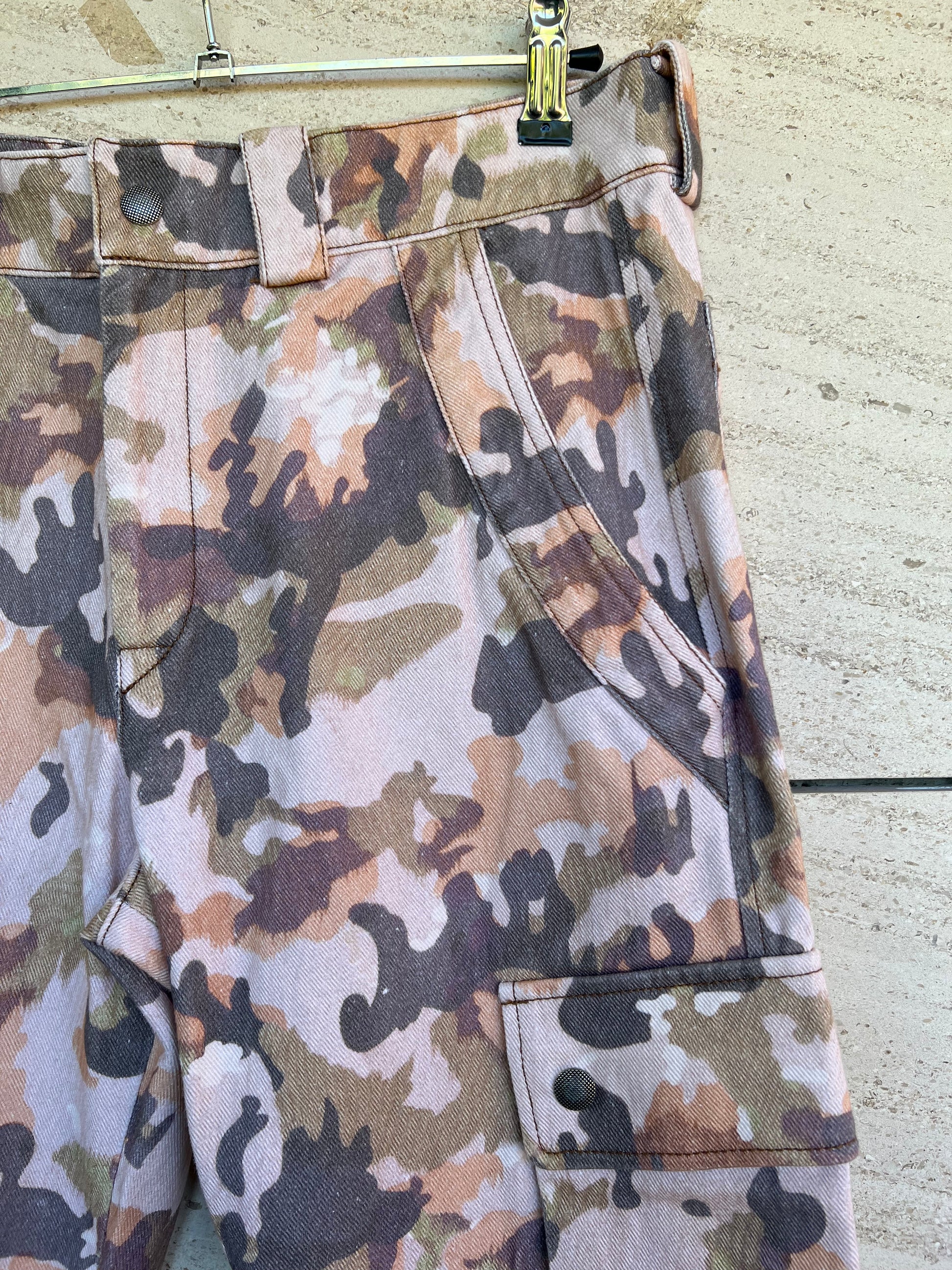 Denim estampado camuflaje tonos tierra. no elástico. Cintura 39 cm , largo 95 cm