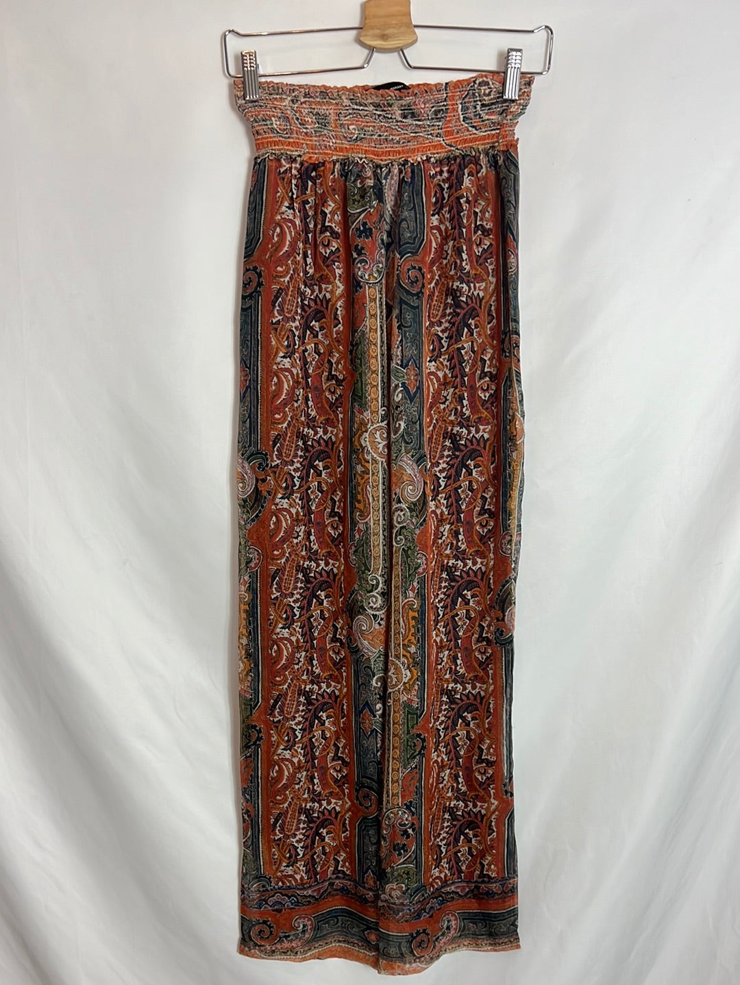 100% seda. Pantalón seda estampado fluido. Cintura elástica y tejido semitransparente. Tiene forro interior. Largo 106cm y cintura 32cm elástica