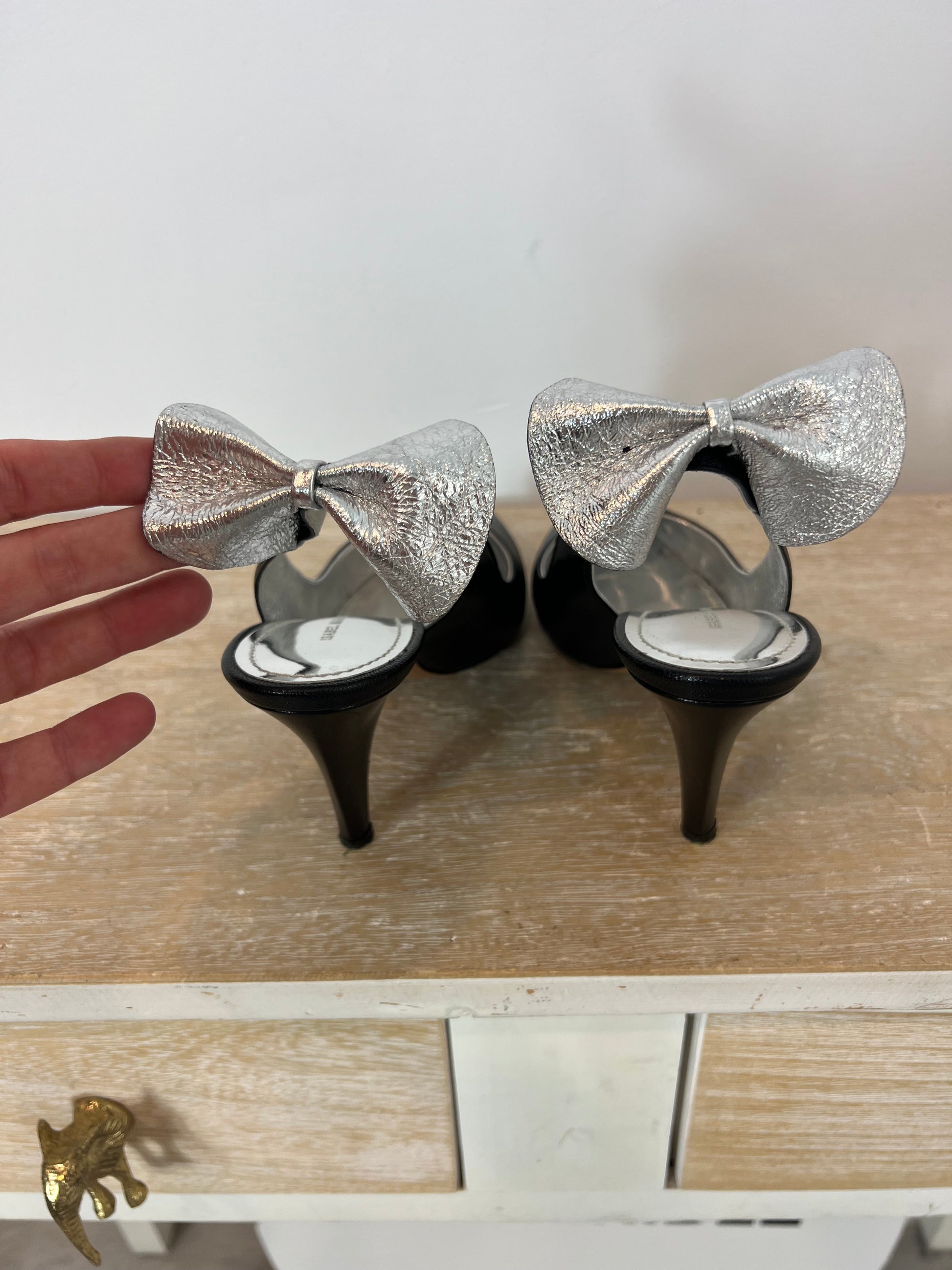 zapatos negro de tacón con detalle de lazada plateada