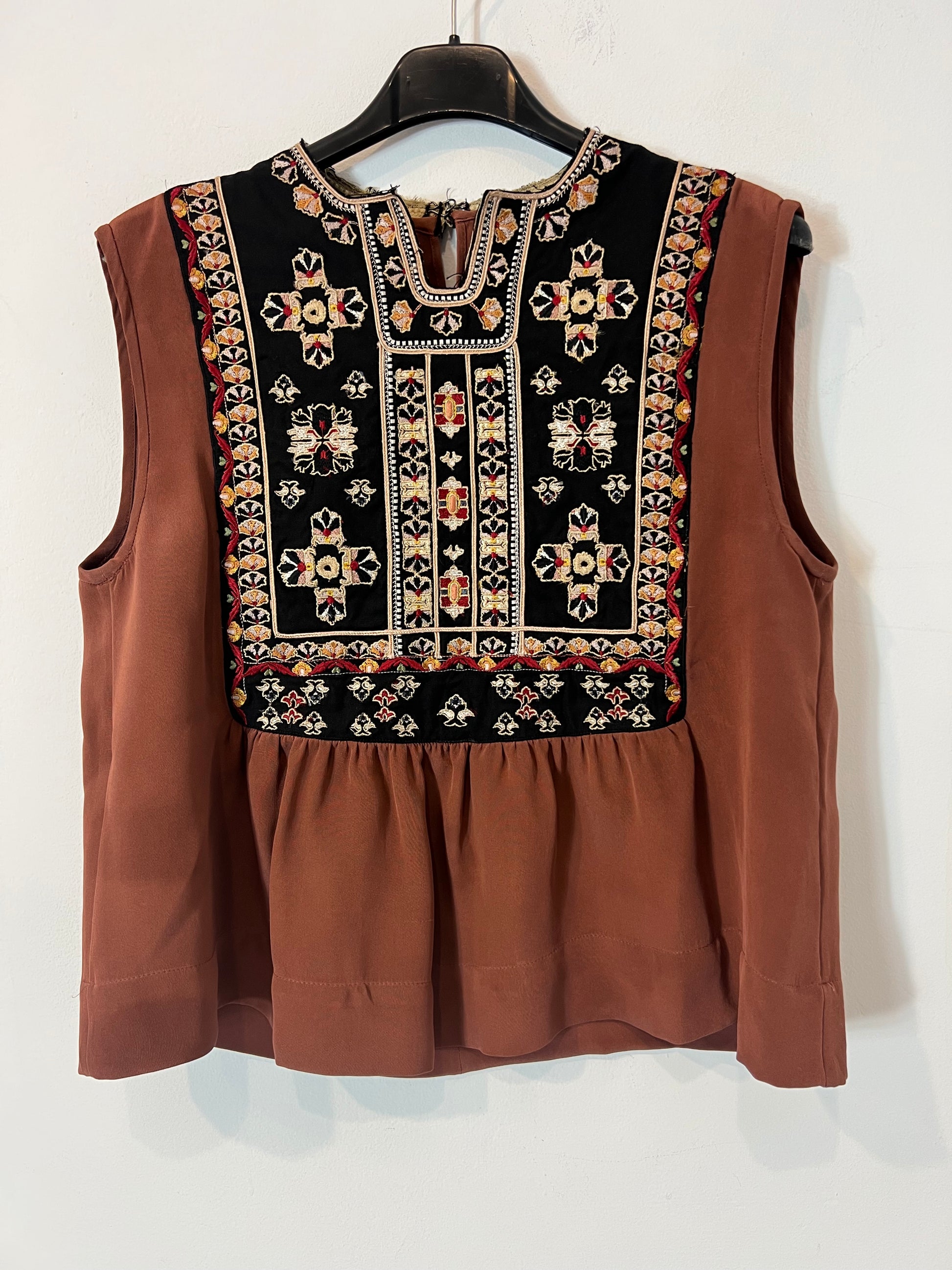 top marrón de seda con detalles bordados. de sisa a sisa 48 cm largo 54 cm. modelo Russ top