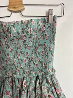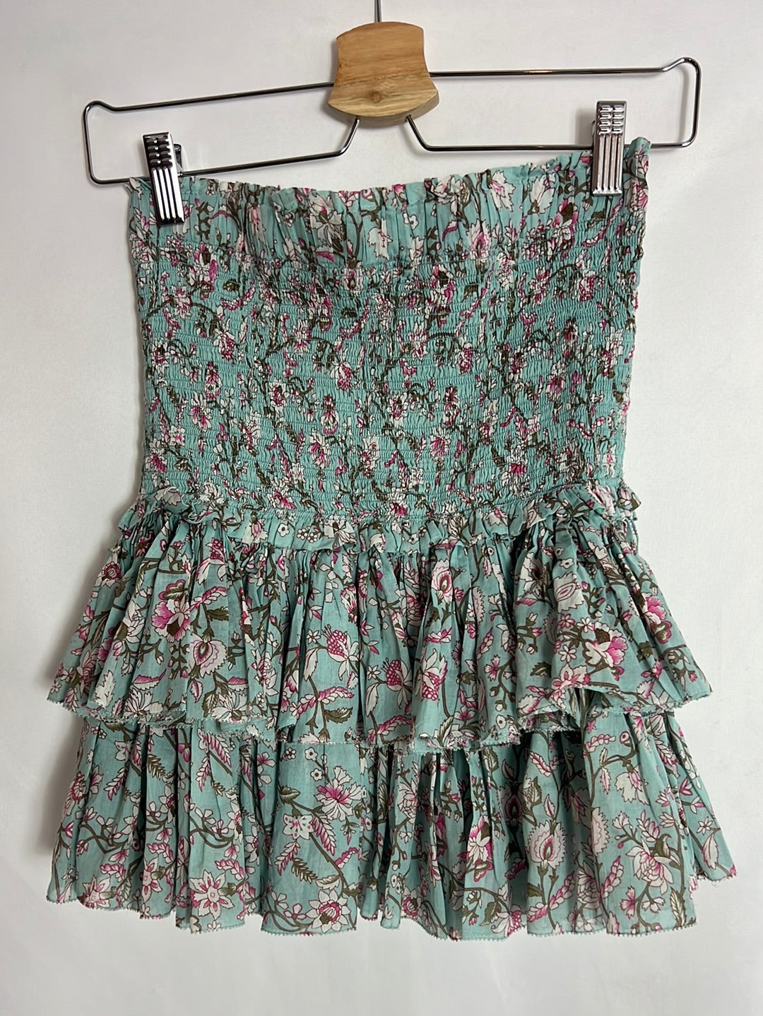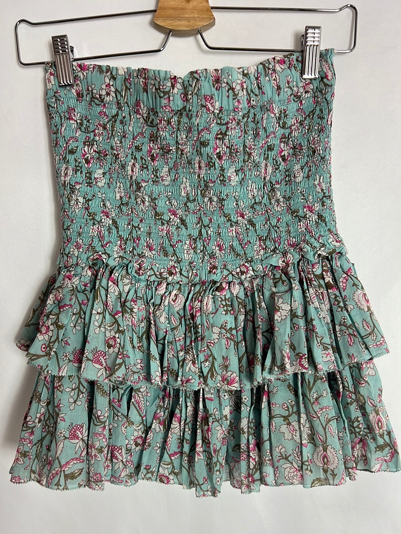 Top palabra de honor azul estampado. Podría usarse como falda. Tejido semi elástico en la zona de nido de abeja