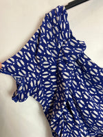 100% seda. Top seda asimétrico azul. Cremallera lateral. Largo desde el hombro 64cm