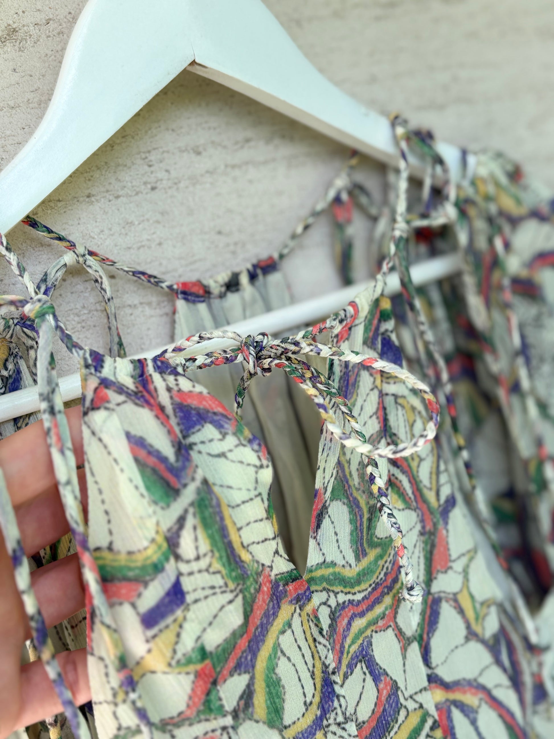 Vestido corto seda nudos escote. Largo 95 cm, espalda 53 cm