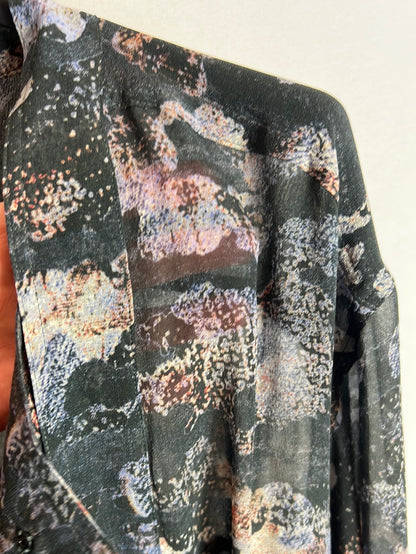 Vestido seda gris estampado. Cadera 45cm, largo 92cm