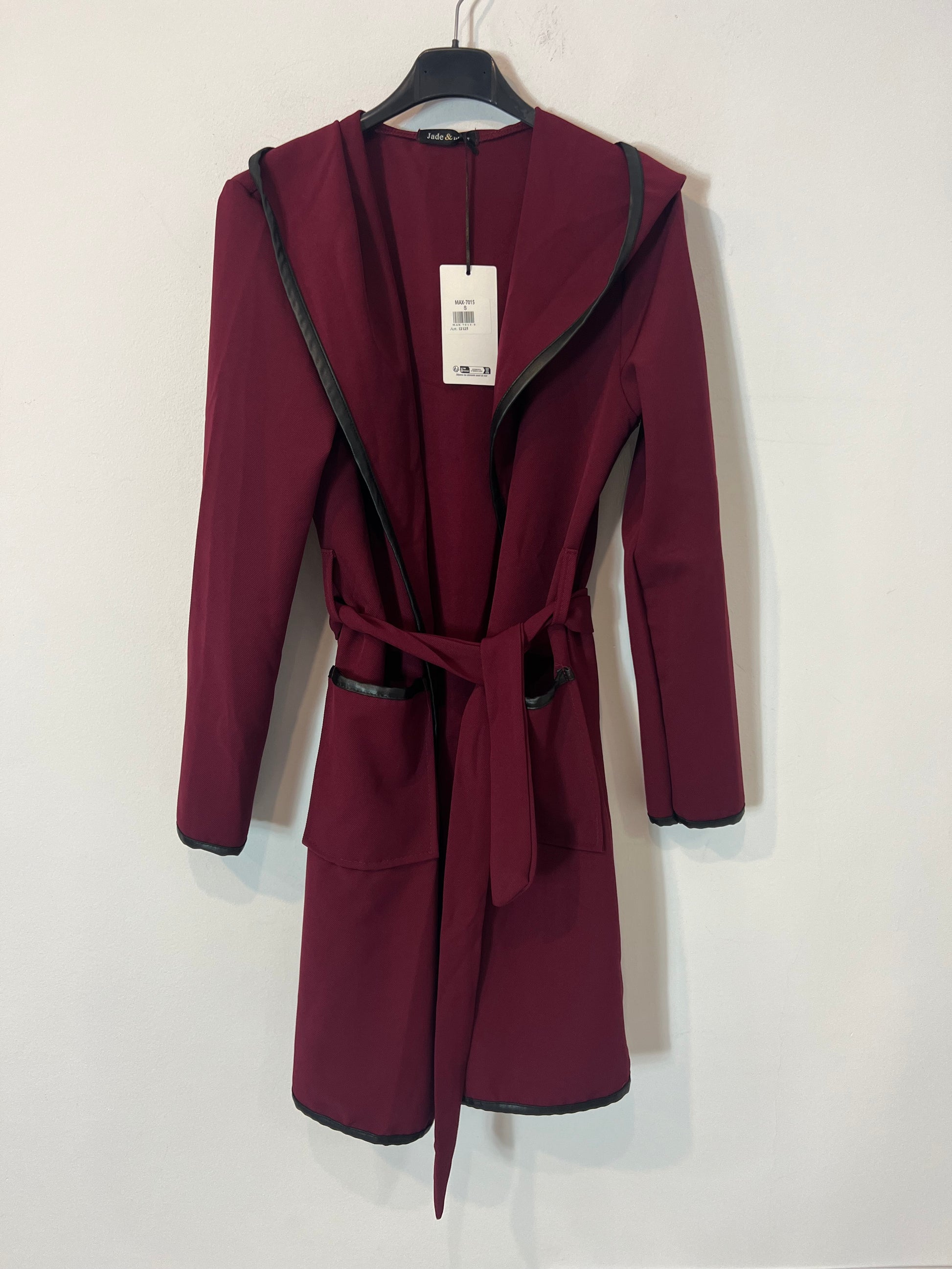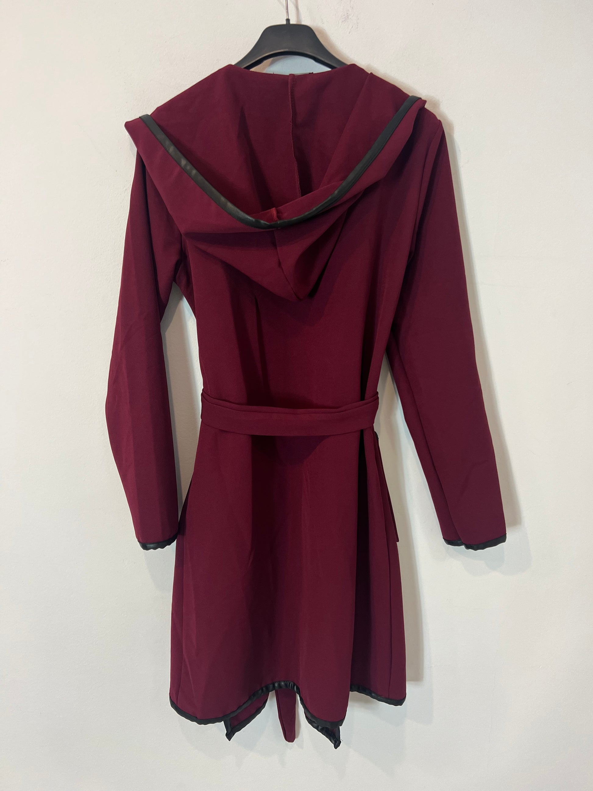 NUEVO CON ETIQUETA. Chaqueta fluida burdeos con detalles en negro. Capucha y cinturón de lazada. Largo 88cm