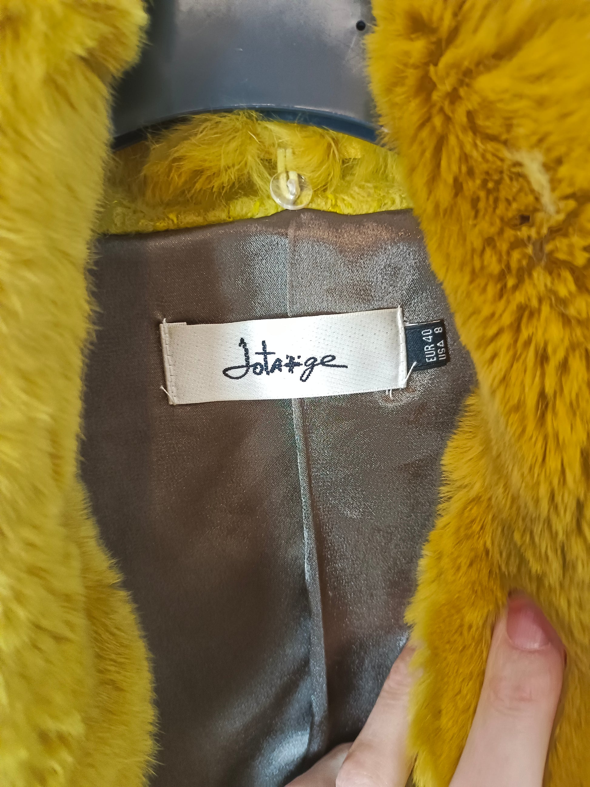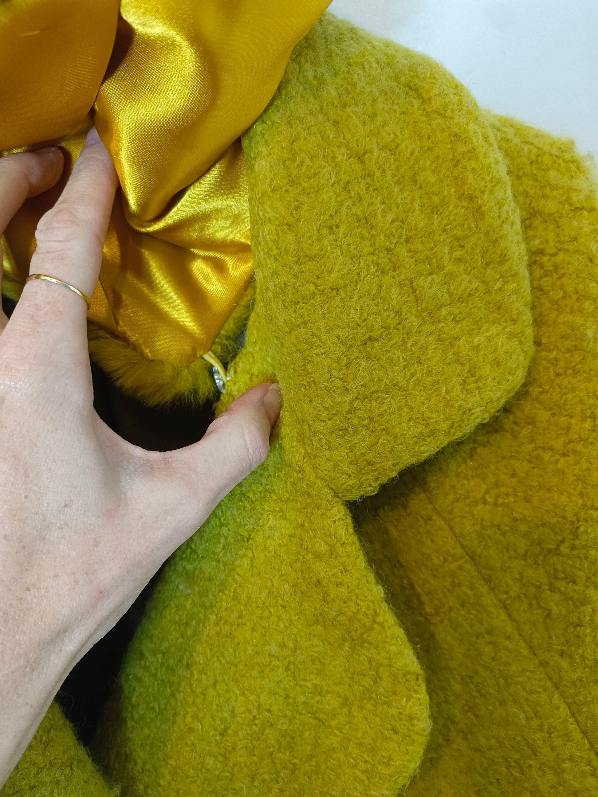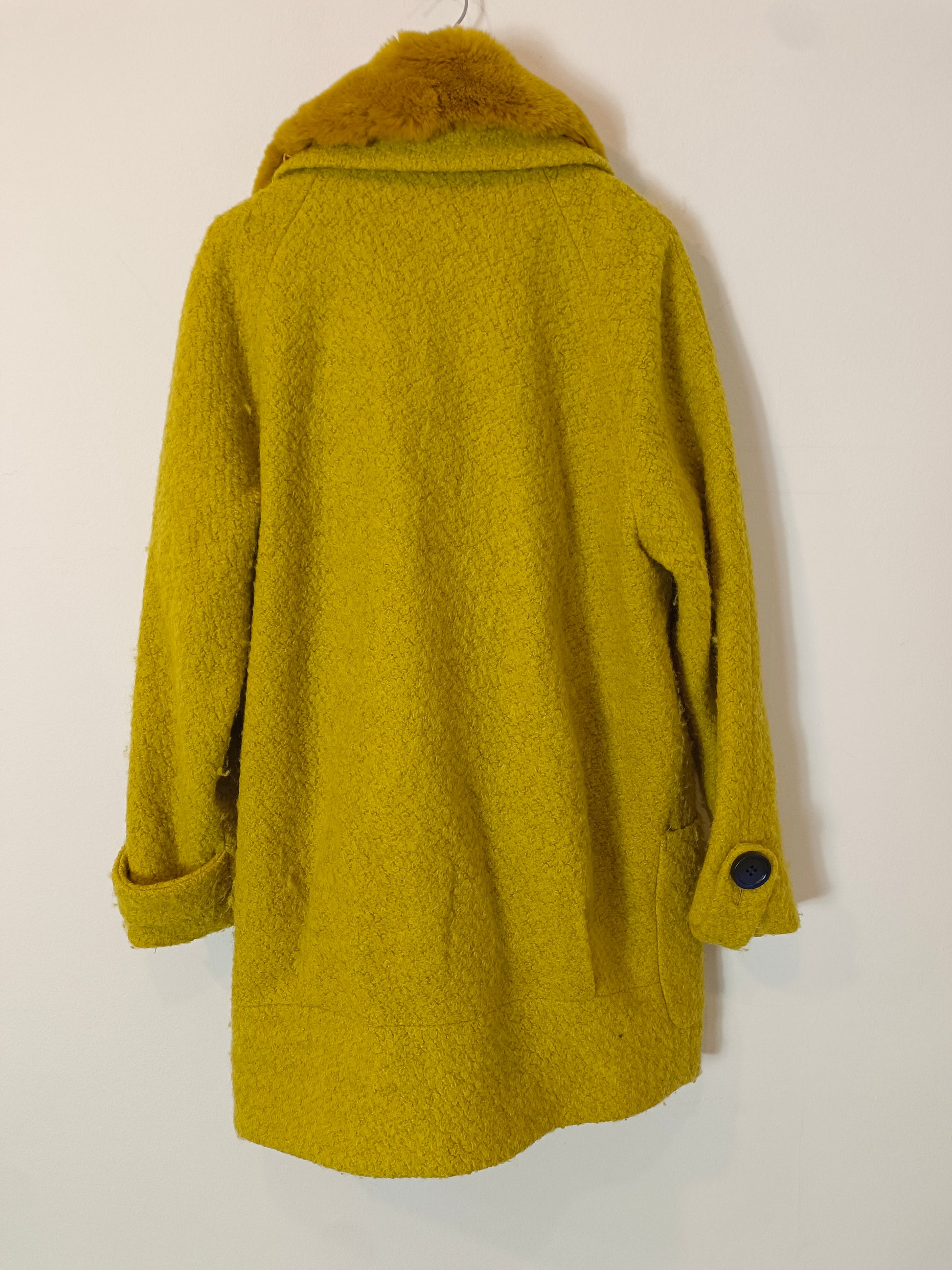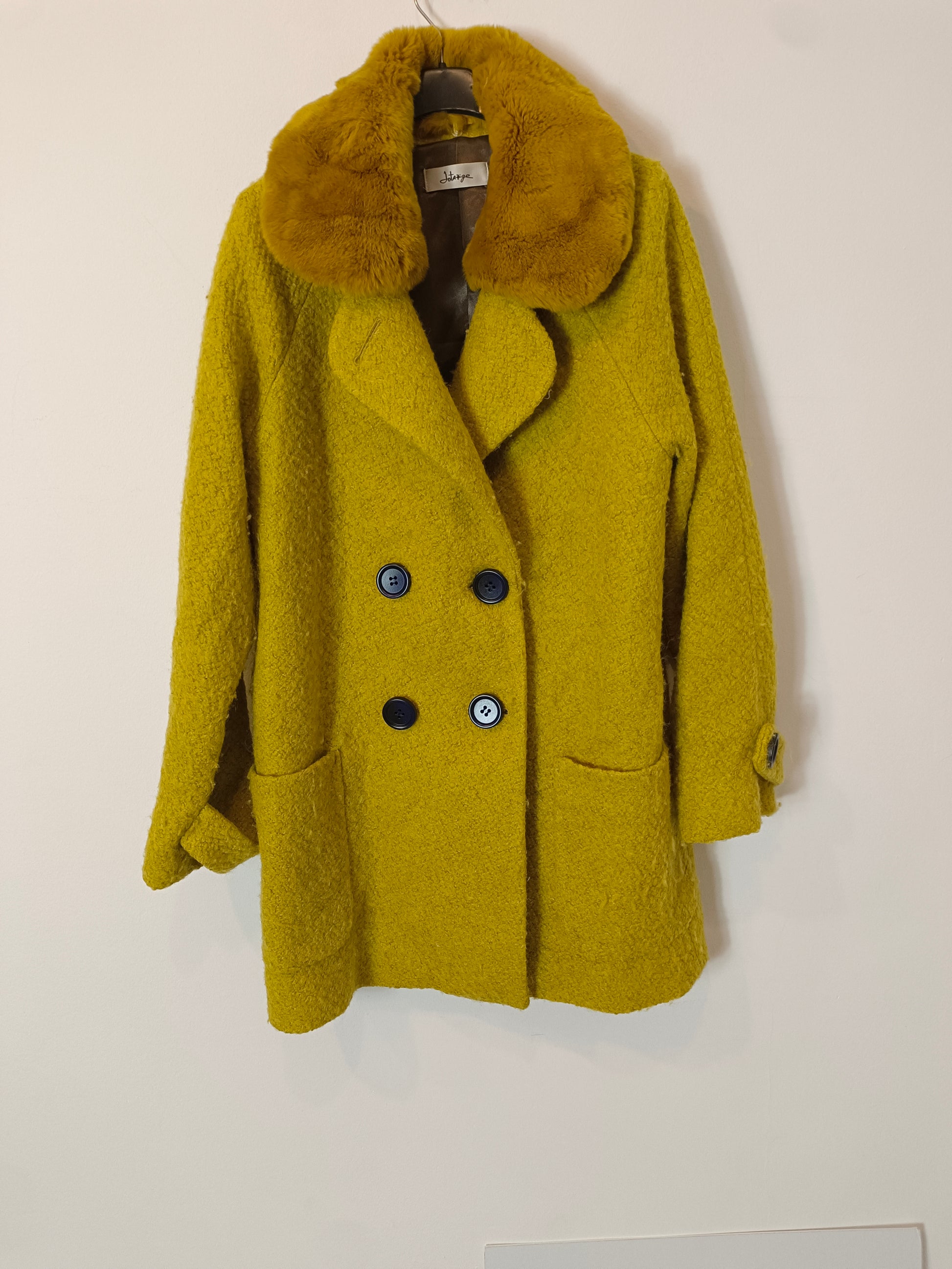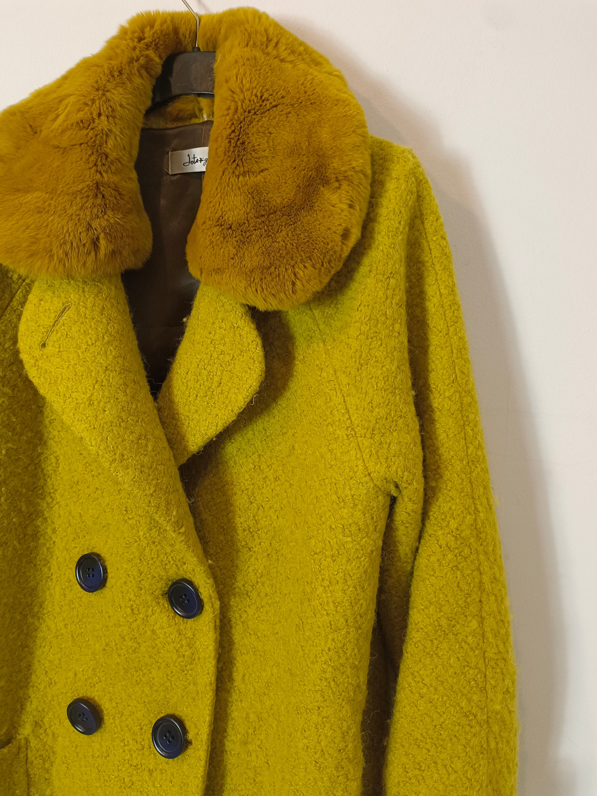 Abrigo mostaza cruzado de paño con pelo en el cuello extraíble. De sisa a sisa 50cm largo 86 cm