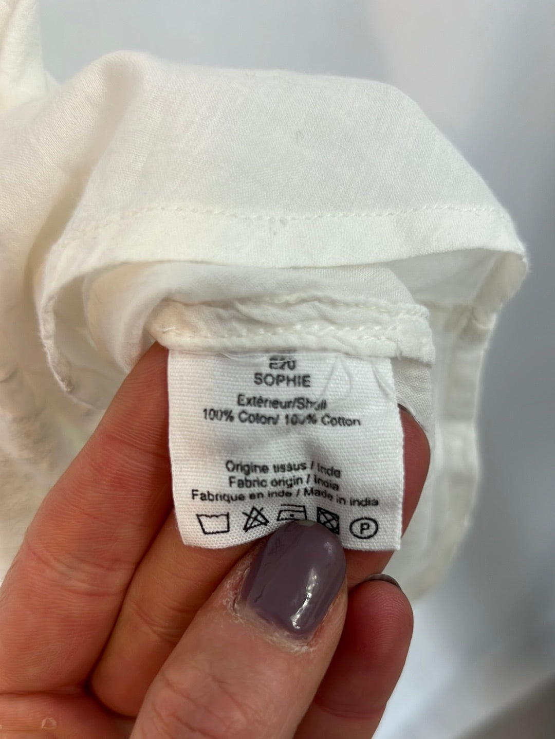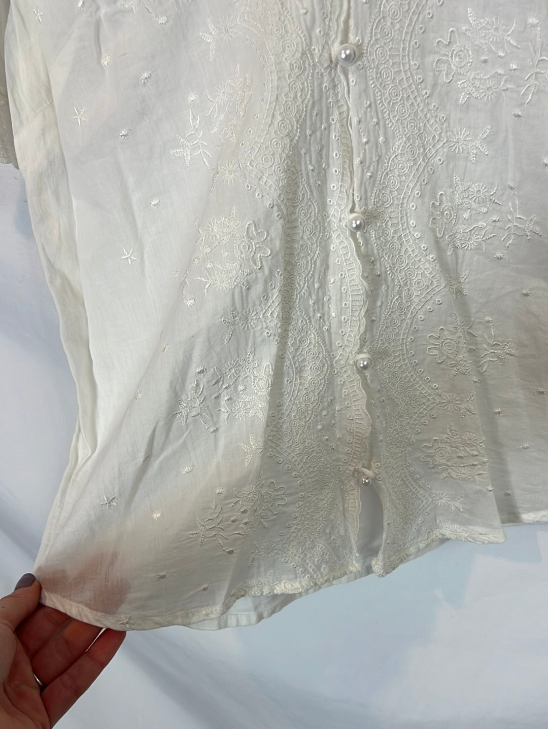 top blanco bordado con botones de perlas bordado. 100%algodón . Hombros 36cm, de sisa a siaa 48cm, largo 61cm