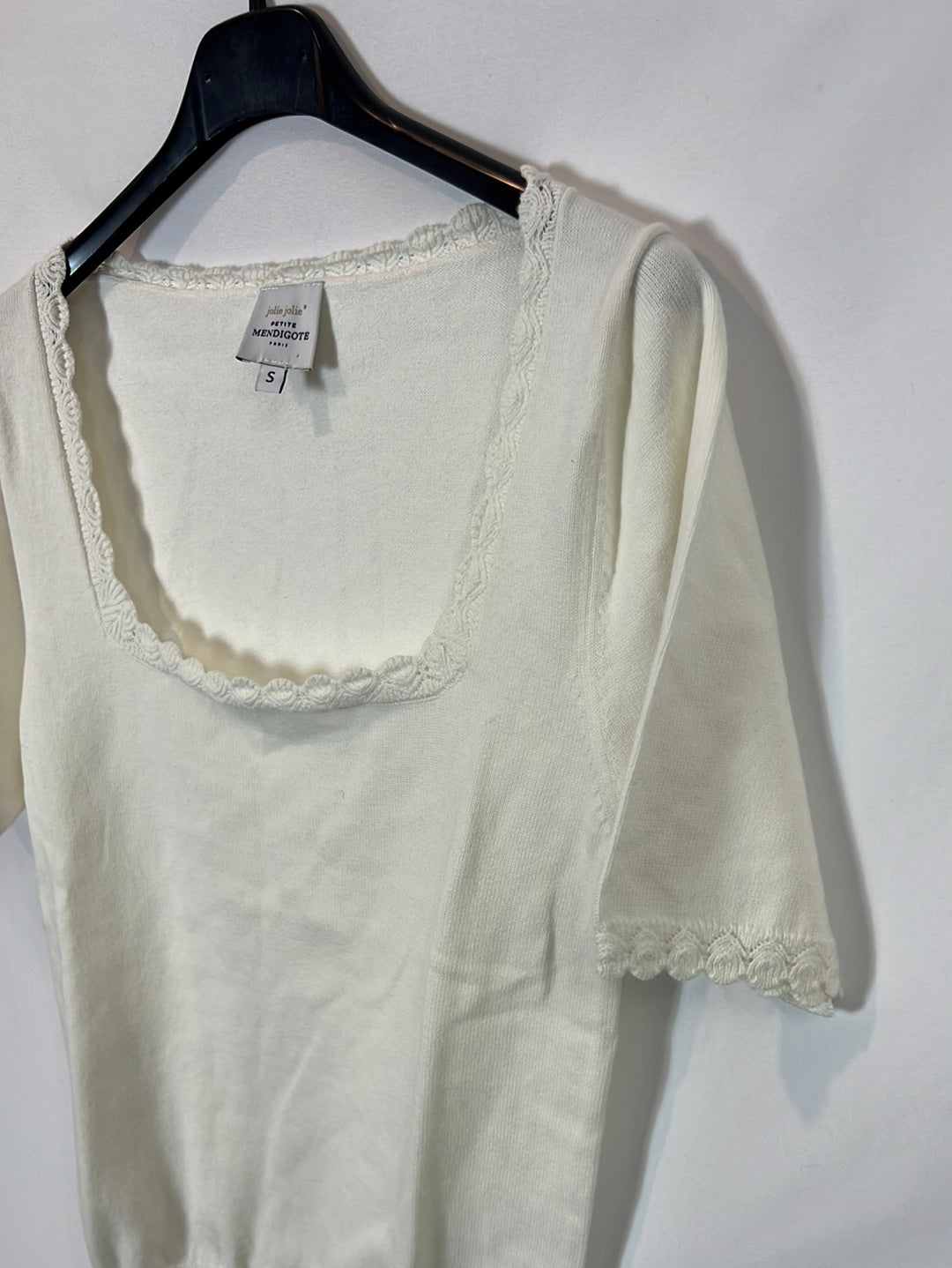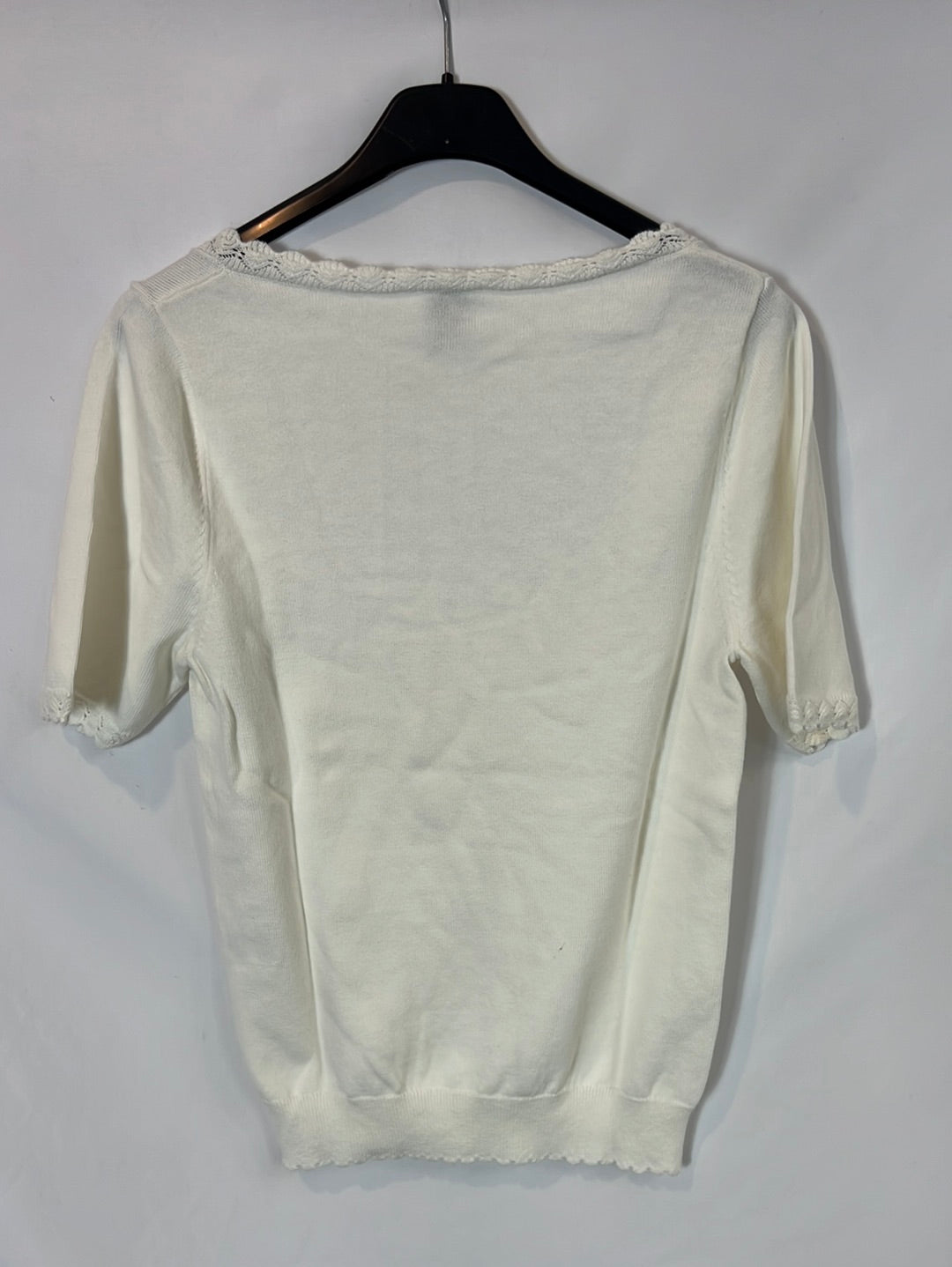 top blanco de punto con detalle de encaje en cuello y mangas. Largo 53cm