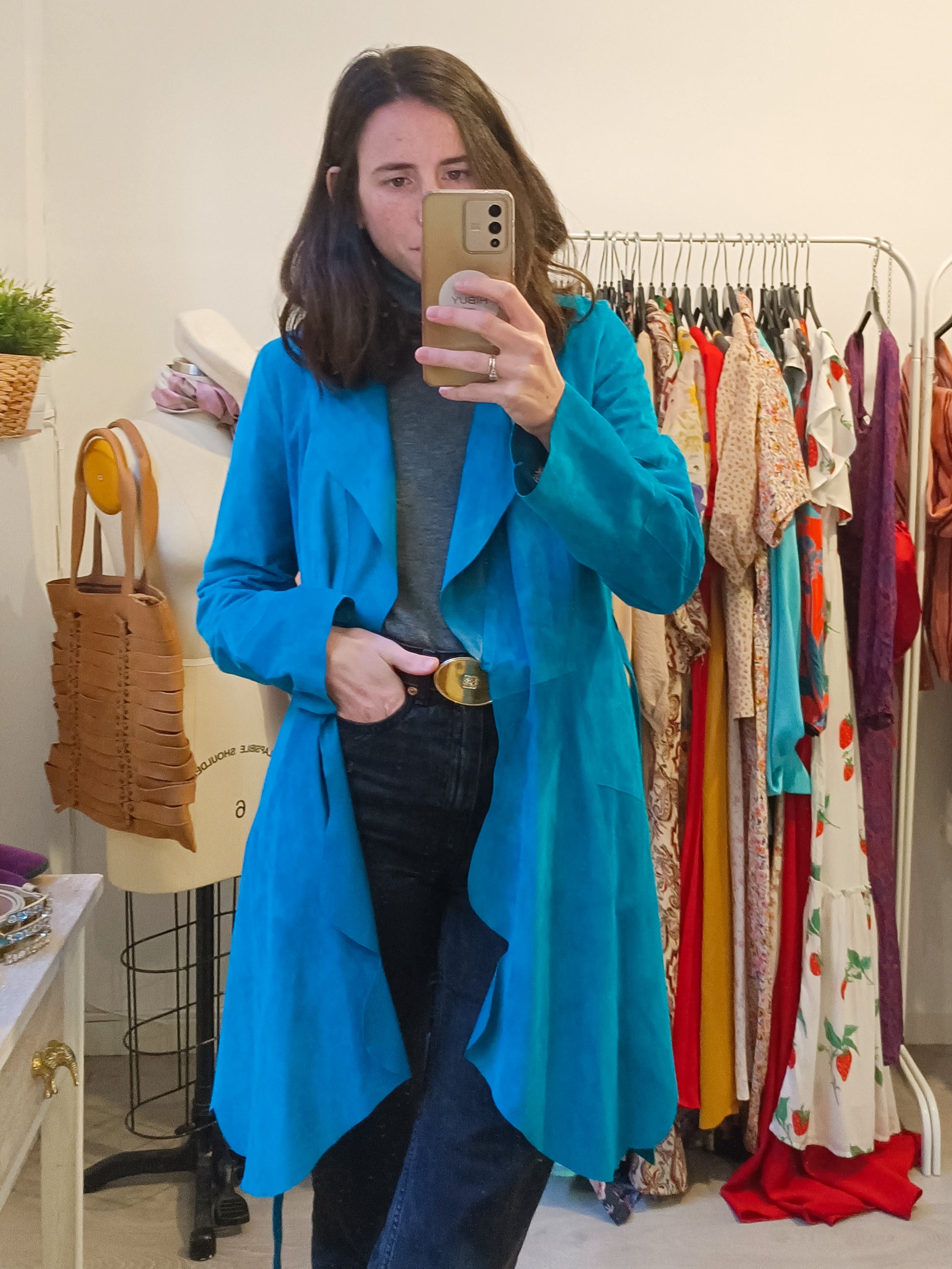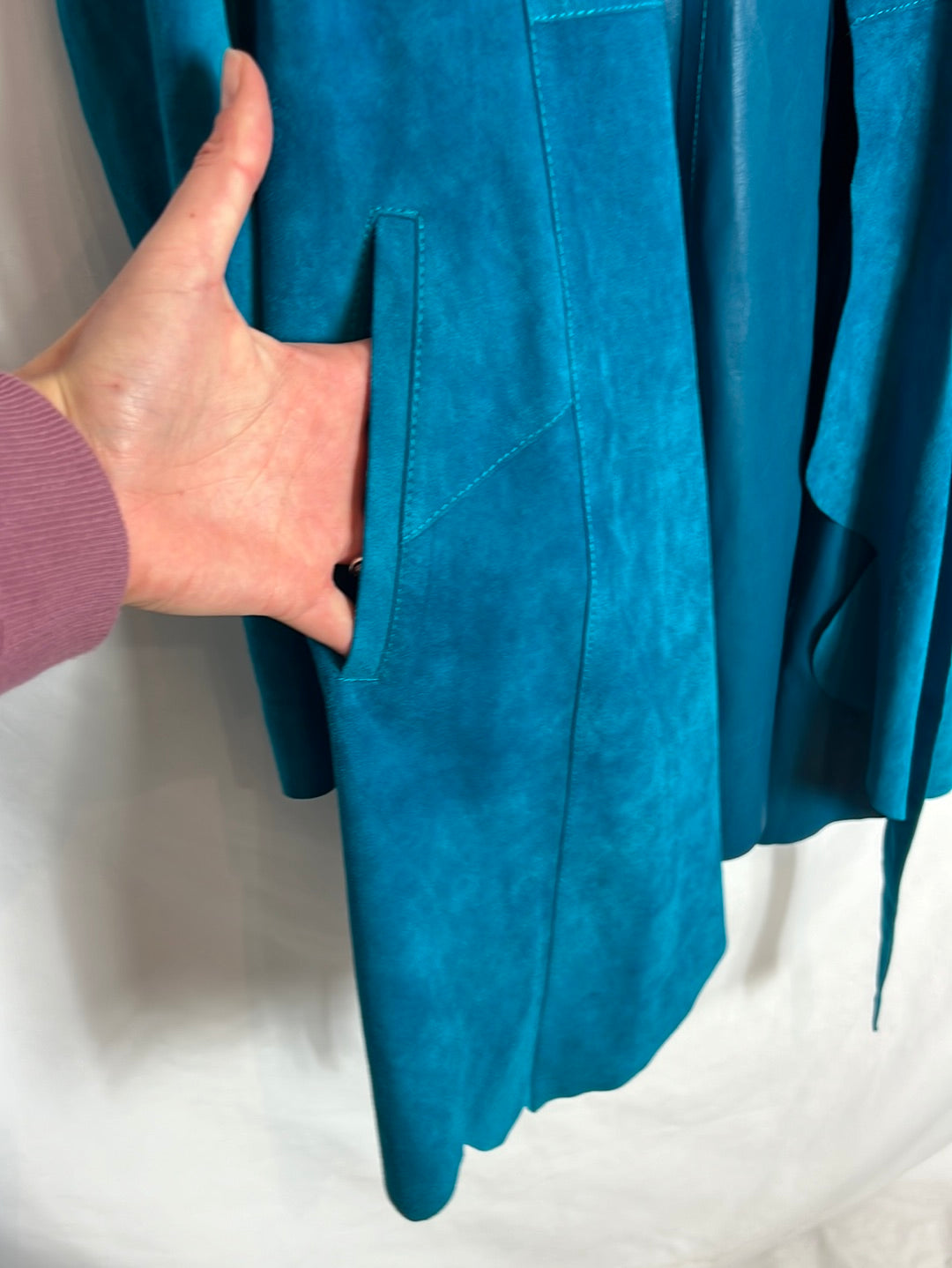 Chaqueta turquesa piel vuelta con bolsillos y cinturón. Cintura 38cm , largo 84cm