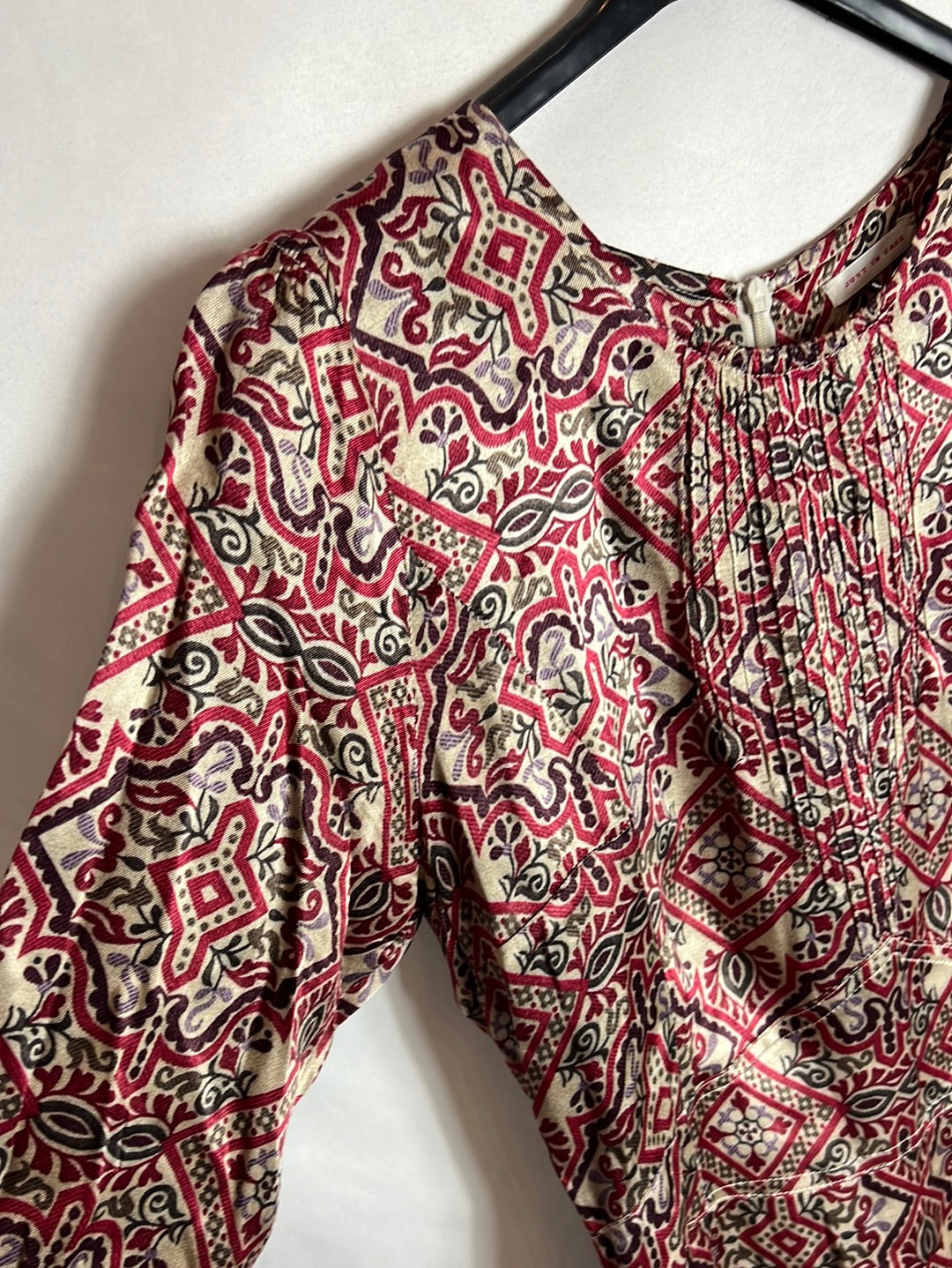 Vestido midi estampado satinado. No elástico. 100% viscosa. Hombros 37cm, largo 96cm, de sisa a sisa 43cm