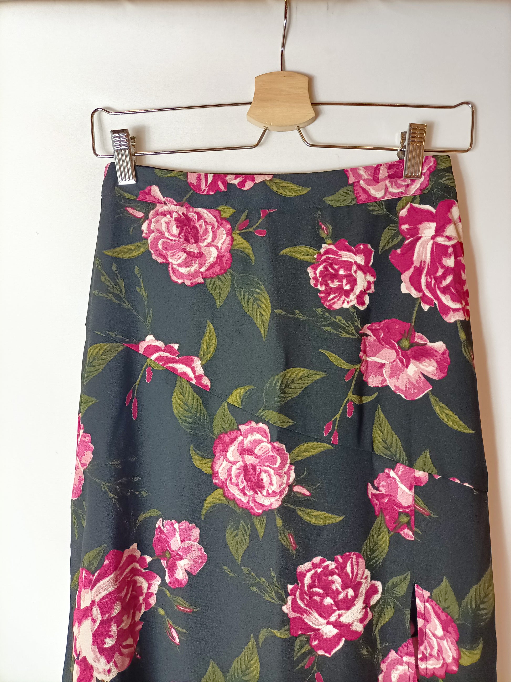 NUEVO CON ETIQUETA. Falda midi negra con estampado de flores. apertura delantera. no elástica.