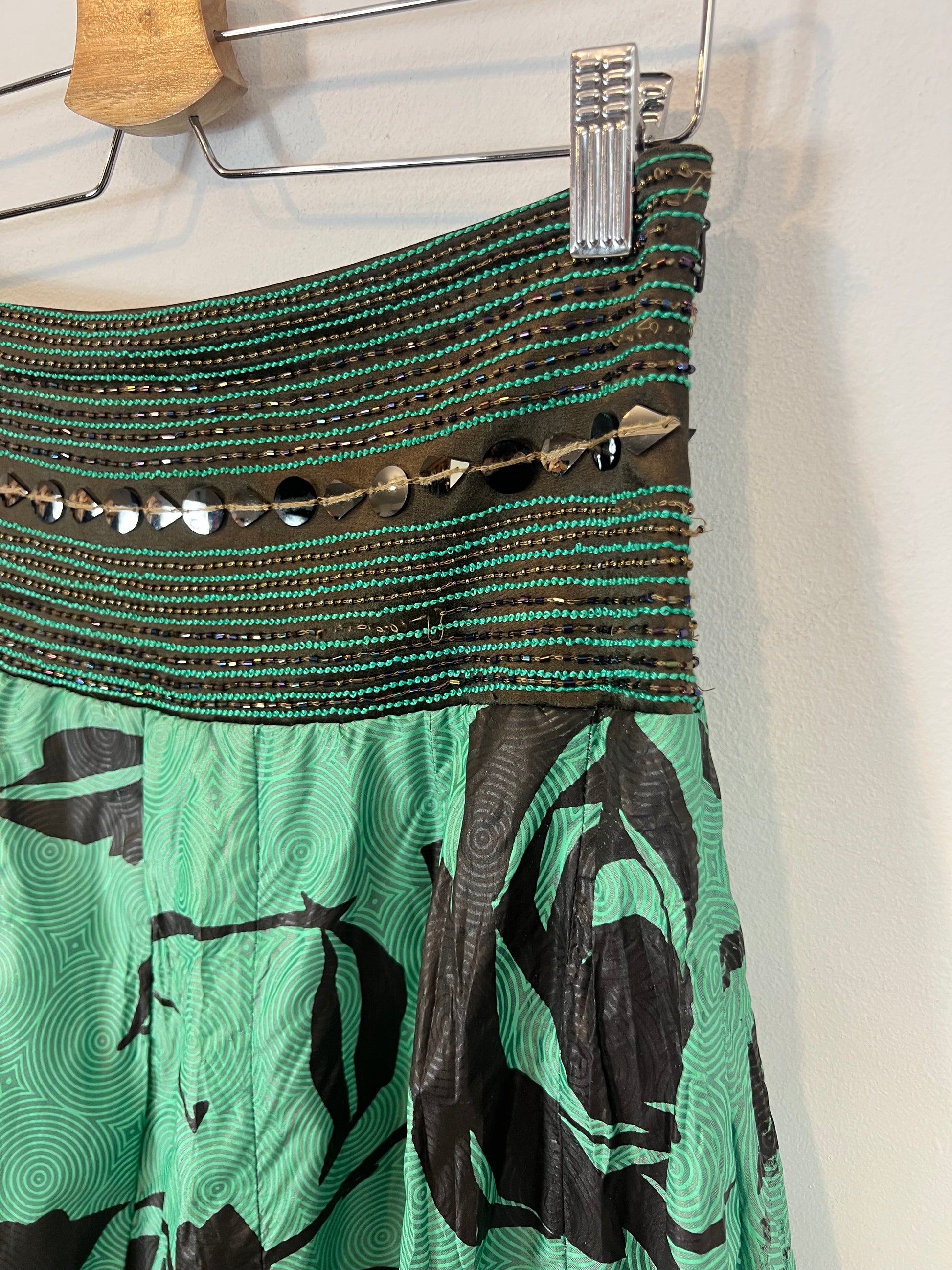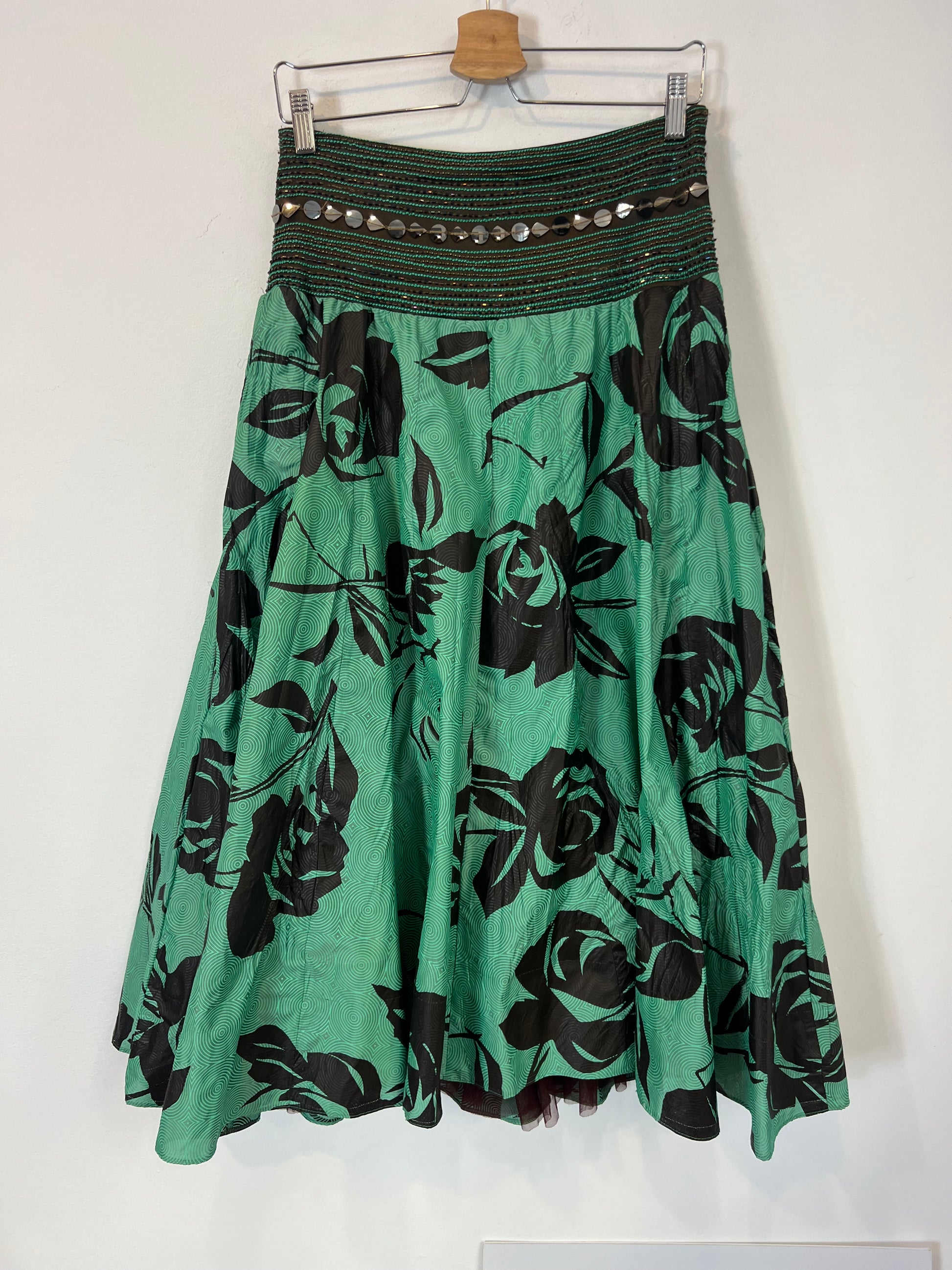 Falda larga detalle abalorios con tu en el forro interior. No elástica Cintura 38 cm, . Largo 90 cm. Tara: mini marca(foto)