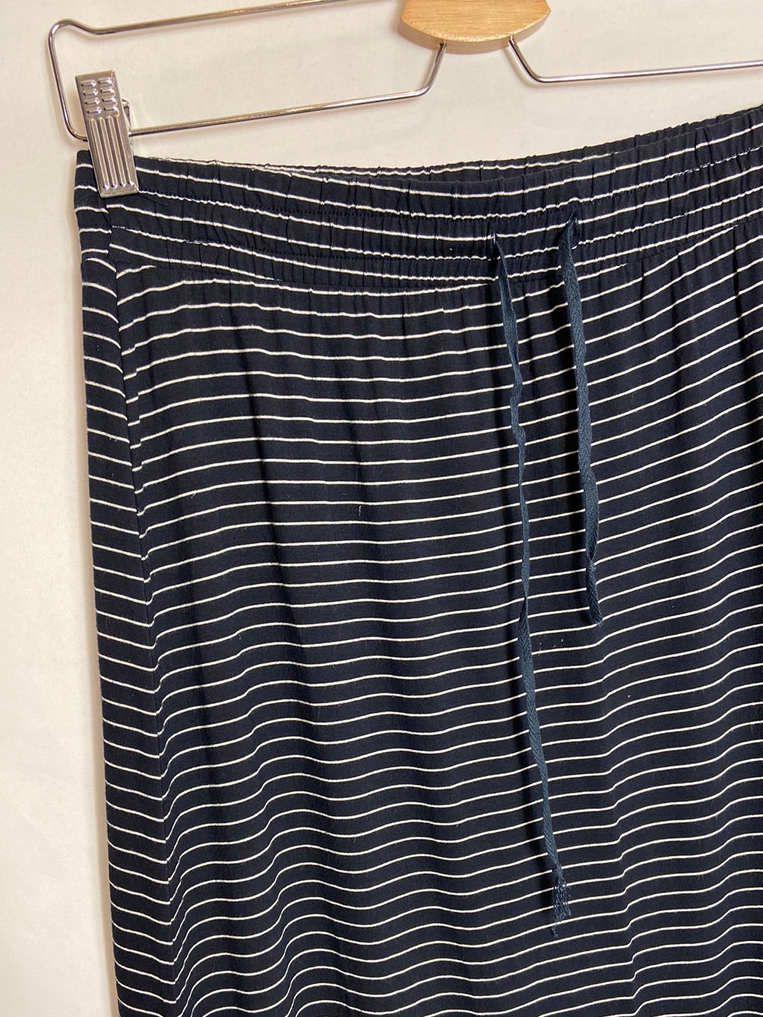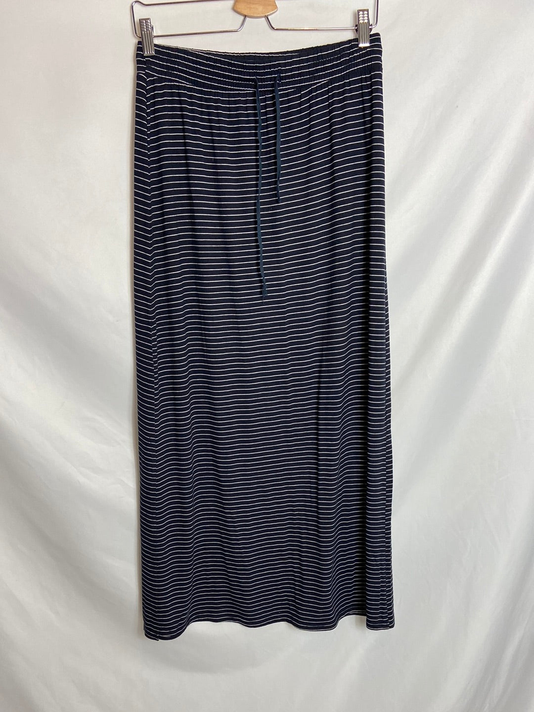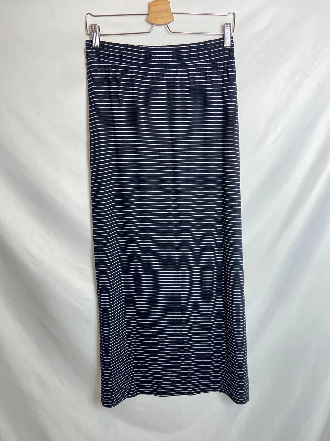 falda midi de rayas azul y blanca de tejido elástico cintura ajustable. Apertura lateral